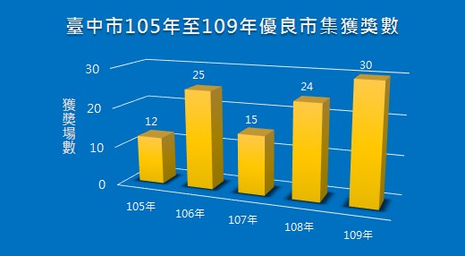 109年度「經濟部優良市集及樂活名攤評核」成績揭曉,台中傳統市集在中央與市府協助下修繕設備並輔導攤商,讓台中以整齊、清潔、明亮的環境再度蟬聯全國15處評核縣市第一名,俗稱「菜市場金馬獎」的評核中更摘星3,891顆,創下全台縣市唯一突破三千顆星的門檻佳績,讓攤商賣得開心、消費者買得放心。