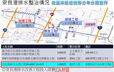 水利局自去(108)年開始修復受損護岸,至今已投入9,800萬元,今年4月完成第一期(永天橋至下莊橋)工程,第二期(台61上游段至永安橋間河段)工程已於今年7月開工,將改善護岸、人行道長度270公尺及周邊道路,新增兩處觀景平台與綠廊空間,市長盧秀燕也於5月21日前往關心及瞭解沿線護岸後續改善情形,並感謝立法委員及市議員的支持,指示持續爭取經費辦理護岸改善,水利局將積極辦理安良港整治工程,感謝地方民眾支持及肯定。