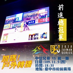 中華職棒總冠軍賽正熱烈開打,台中地主隊中信兄弟與統一獅爭霸,中信兄弟移師台南棒球場征戰氣勢如虹,目前已奪3勝,再取1勝即奪冠。為回應球迷熱情,台中市政府運動局加碼今(5)晚6時35分在台灣大道市政大樓前廣場直播賽事,邀球迷一同集氣,歡迎踴躍參加。