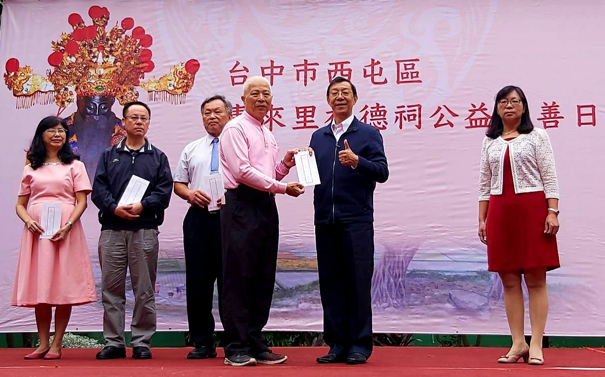 台中市西屯區惠來里福德祠今(8)日舉辦公益慈善日活動,捐贈各弱勢團體、社福機構、里內機關經費,及頒發學校、學童獎助學金等,發揚土地公親民愛民的服務精神。民政局長吳世瑋代表市長盧秀燕到場頒獎,感謝惠來里福德祠長年推動公益活動,今年也捐贈100萬元,提供西屯區國中、小學冷氣設備添購經費,堪稱台中市公益典範。