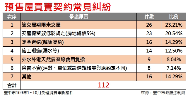 截至今年10月,台中市政府受理房屋買賣申訴案共232件,預售屋消費爭議佔112件,較去年同期增加將近一倍。法制局分析交易糾紛主要為逾期交屋、交屋保留款額度不足房地總價5%、解除契約定金返還爭議、施工瑕疵、外水外電或天然氣管線費用負擔爭議、廣告不實等六大類。法制局提醒民眾與建商簽訂契約時應仔細審查契約條款,減少交易糾紛。