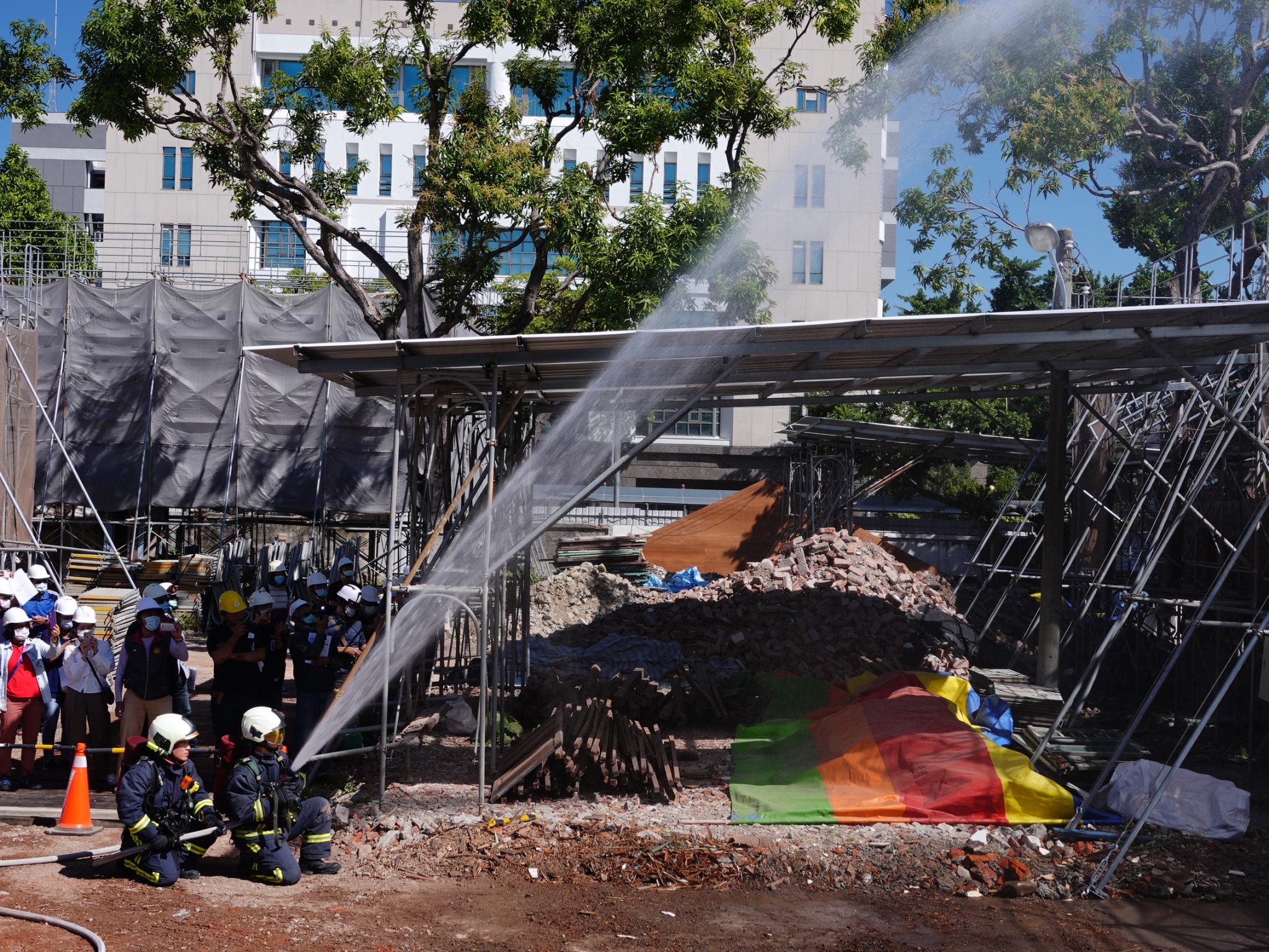 演練內容為工程人員於施工時不慎引發火災且受傷,現場先行斷電以免人員作業時觸電,並進行消防通報,由工地滅火班進行「自救」、協力廠商合力「共救」,用現地可以滅火的設備與材料,如滅火器、水源、砂、土等進行初期滅火,也針對受傷人員進行救護;消防車抵達現場前,將通道雜物與車輛淨空,並引導消防車進入現場「公救」,消防人員使用噴霧水柱進行滅火。