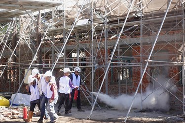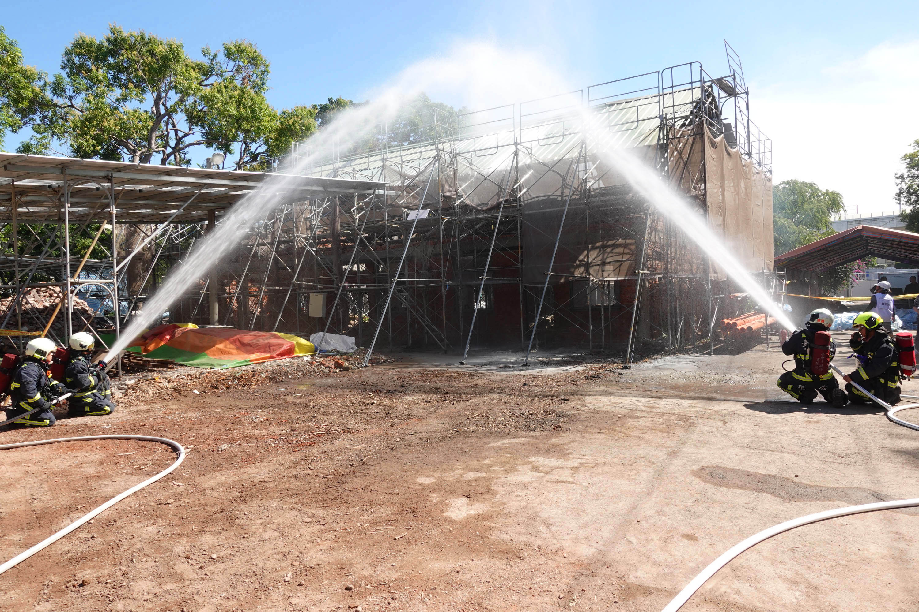文化局說明,今日防災演練由專業消防人員以「災害預防與宣導」為題作專題演講,說明工地特性與致災因子,以歷史建築「台中刑務所官舍群」修復工程現場為基地,由現場工程人員及消防人員進行防災實地演練。