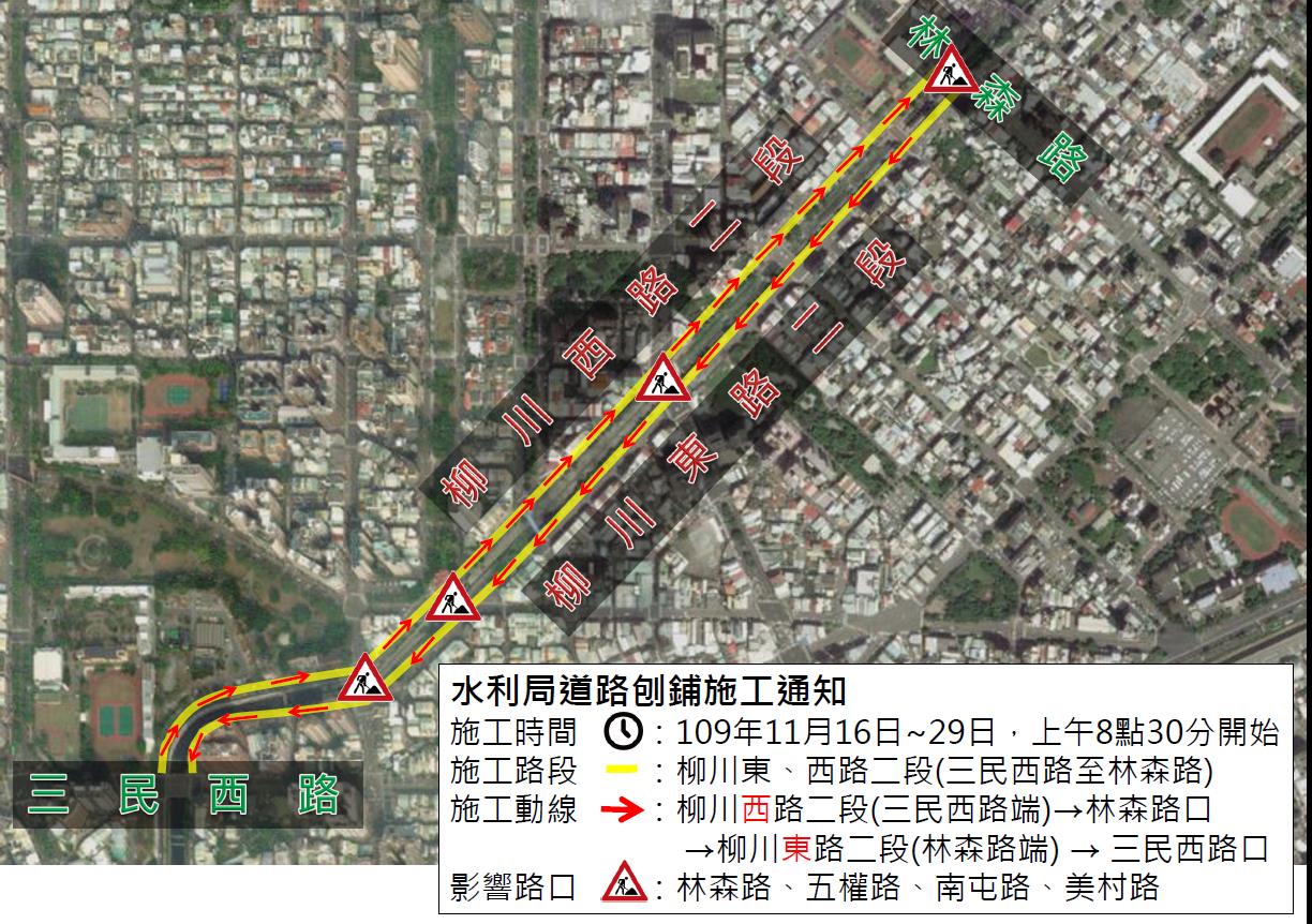 水利局表示,柳川污染整治及環境改善工程三民柳橋至林森柳橋自開工至今約2年,除辦理流域治理工程之外,也協調進行道路下管線遷移等作業,為避免道路多次開挖重鋪,周邊道路以臨時修復路面,供民眾通行,現工程接近完工,預計於11月16日起辦理柳川東、西路二段刨鋪作業,請用路人提前改道,如行經柳川周邊道路時,配合交管人員引導減速慢行,切勿爭道行駛,並注意行車安全。