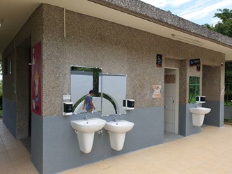 家住太平的王姓民眾分享,921震災紀念公園廁所整修前地面高低不一,且沒有扶手、坐式馬桶及急救鈴,使用時會擔心不小心踩空,如今改善後地面平整且設備完善,安全許多,「一個人也能放心上廁所」,尤其門板還有太平農產設計十分可愛,如廁環境很友善。