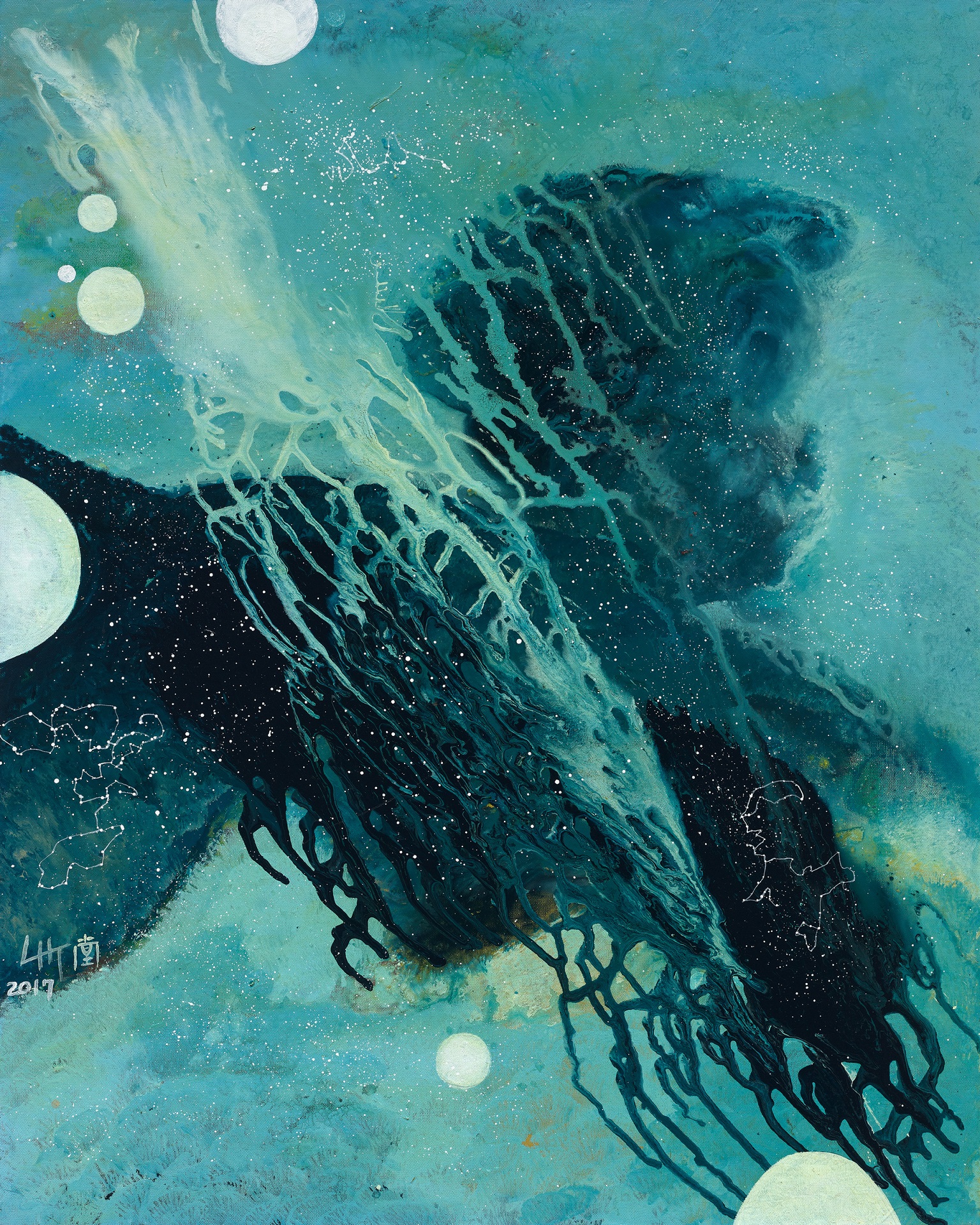 林輝堂表示,將陶瓷釉料放入畫布具有一定難度,他創作時藉由速度和水分的控制,選擇讓顏色之間相互自然碰撞的方式,用作品叩問宇宙未知的探索。包含〈晝與夜〉是在表達時間的移動,和空間的相互關係;〈伏羲先天八卦〉方位均按各卦的坐落,如乾南、坤北、離東、坎西、兌東南、艮西北、巽西南、震東北並結合星座展開;〈文王後天八卦〉金、木、水、火、土五行,依方位排列。