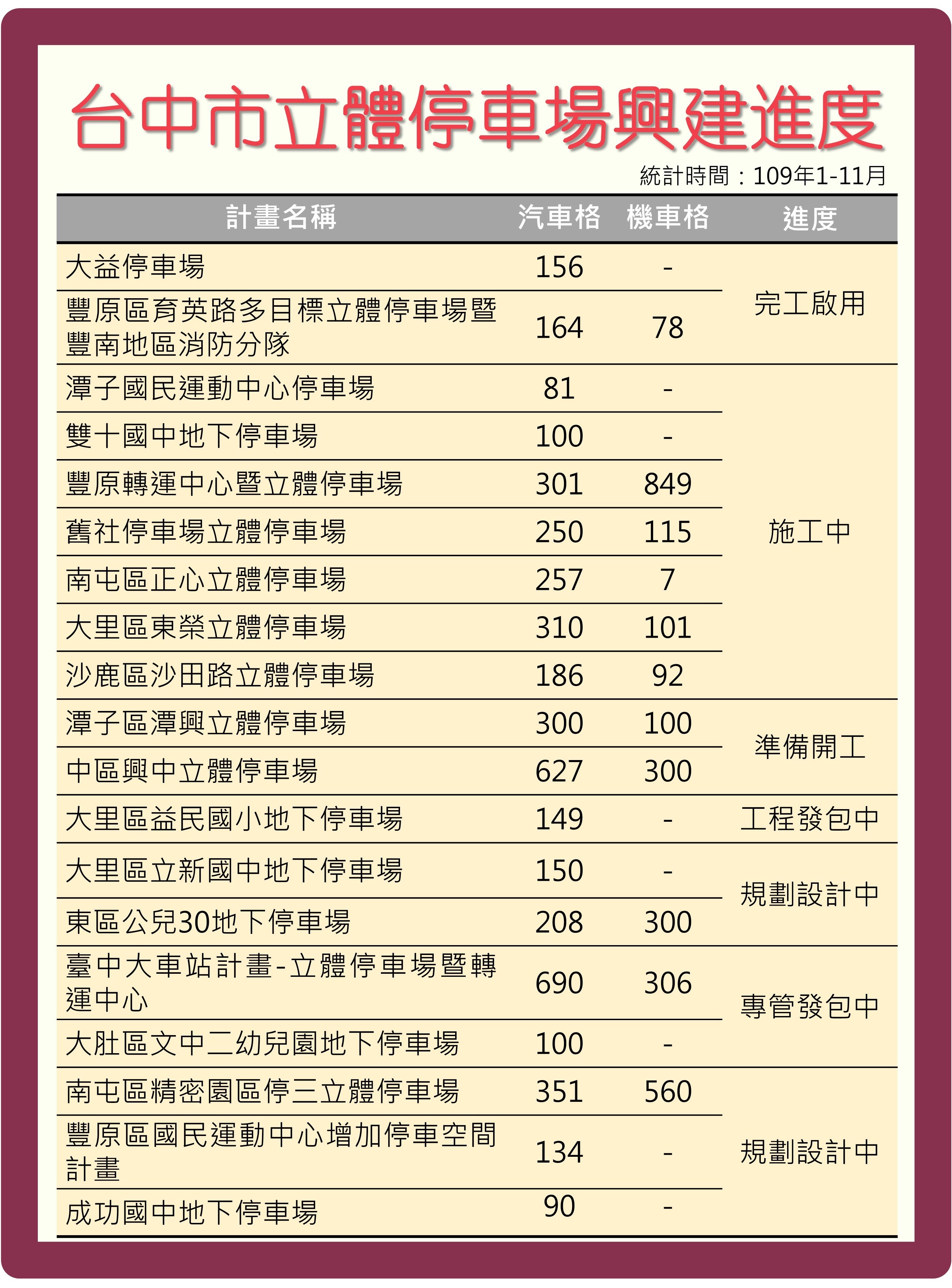 交通局指出,交通局正積極增設立體停車場,目前已陸續投入55億元興建19座立體停車場,其中西區大益停車場、豐原區育英路立體停車場已完工;北屯區「舊社地下停車場」、大里區「東榮立體停車場」、南屯區「正心立體停車場」及沙鹿區「沙田路立體停車場」等4案已開工動土,加上施工中的「潭子國民運動中心停車場」、「雙十國中地下停車場」、「豐原轉運中心暨立體停車場」,共有7場正施工中。