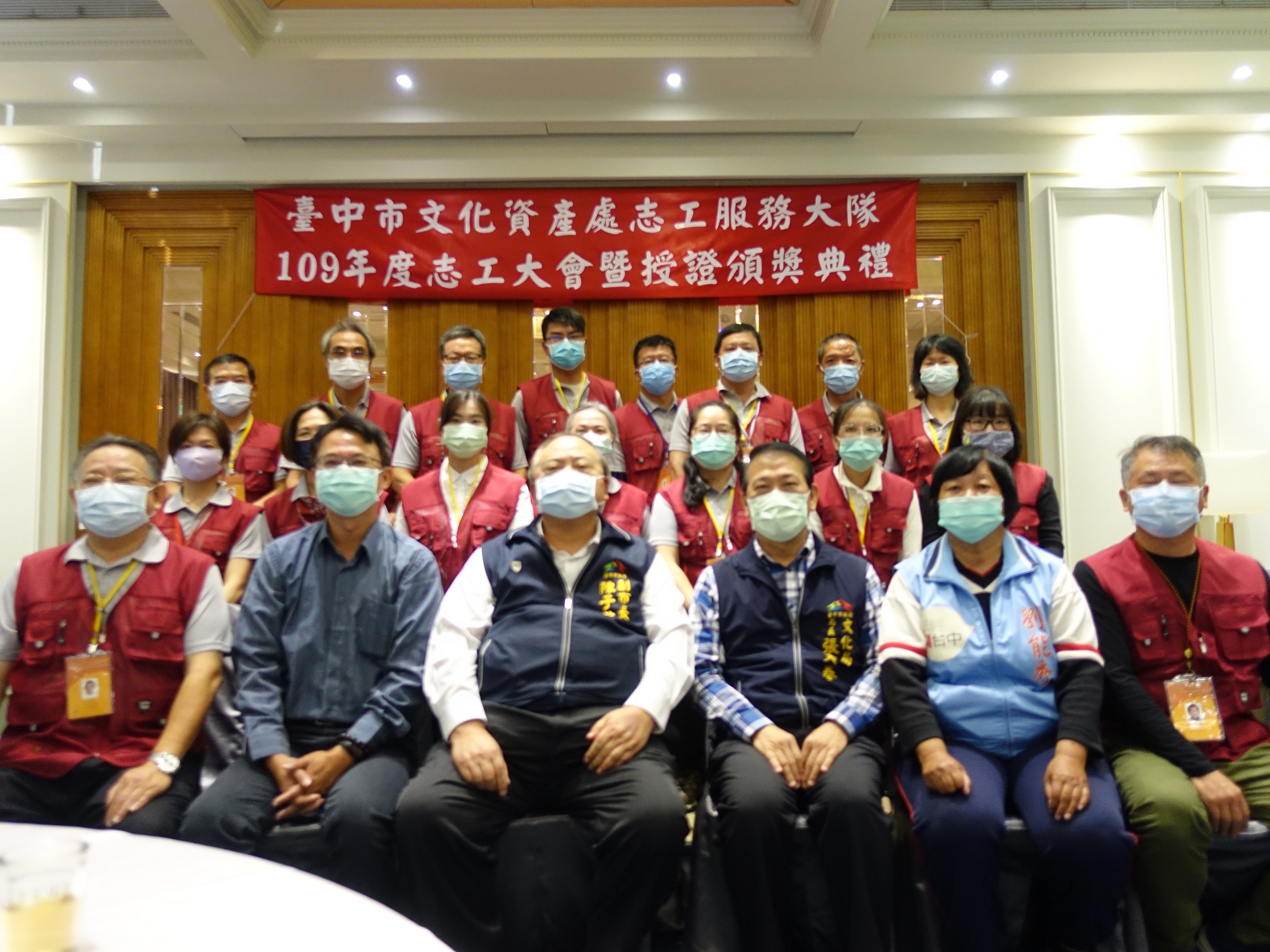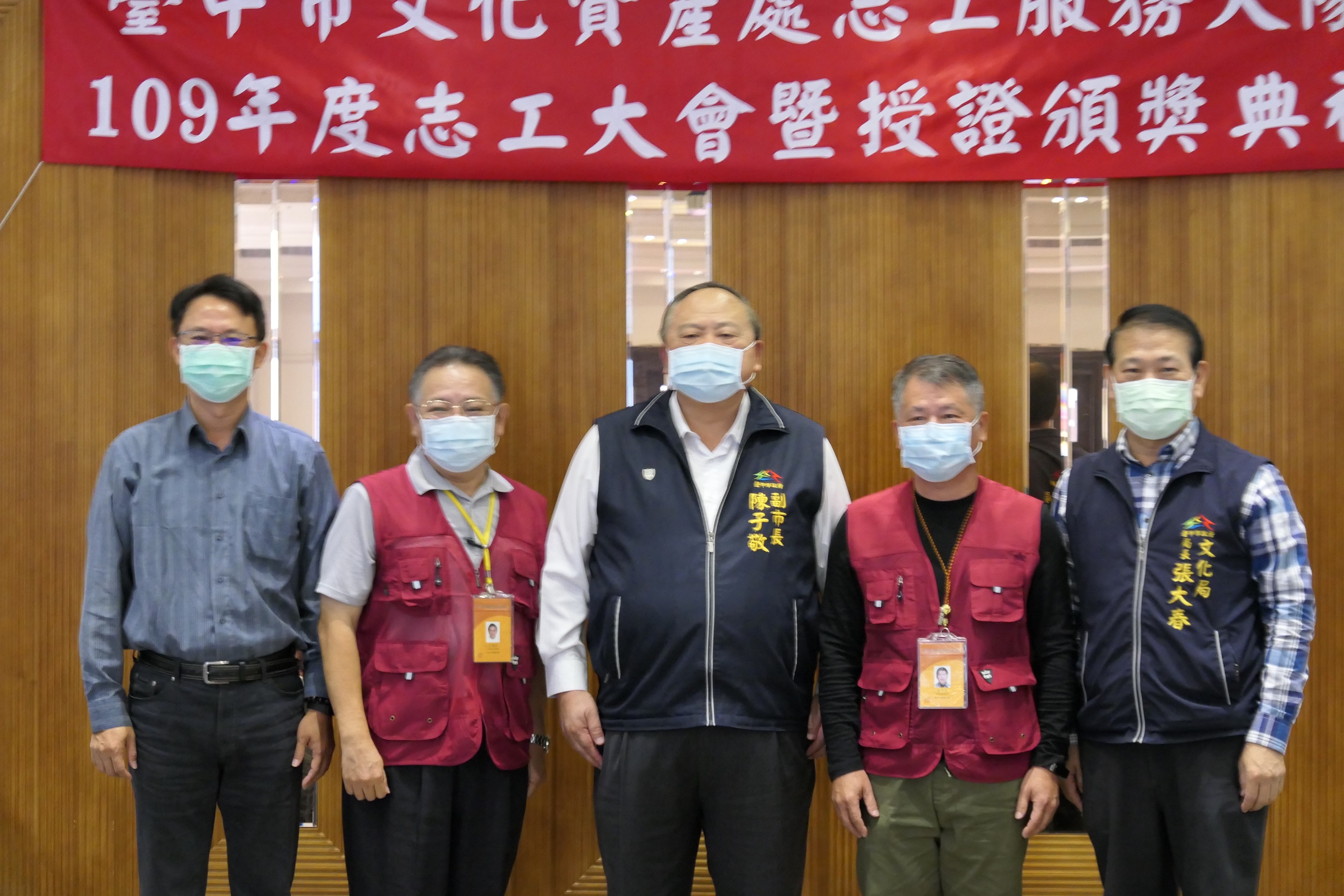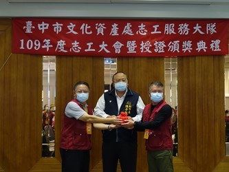 台中市文化資產處今(5)日舉辦「109年度文資志工表揚授證典禮」,副市長陳子敬感謝143名文資導覽志工無私奉獻假日時光,提供民眾專業導覽解說服務。其中,服務於牛罵頭遺址文化園區的海線支隊志工蔡嵎丞獲頒「特殊貢獻獎」,中區支隊也有14名志工獲頒「服務年資金牌獎」,表彰他們在台中州廳、孫立人將軍紀念館等地提供文資導覽服務超過10年的貢獻。