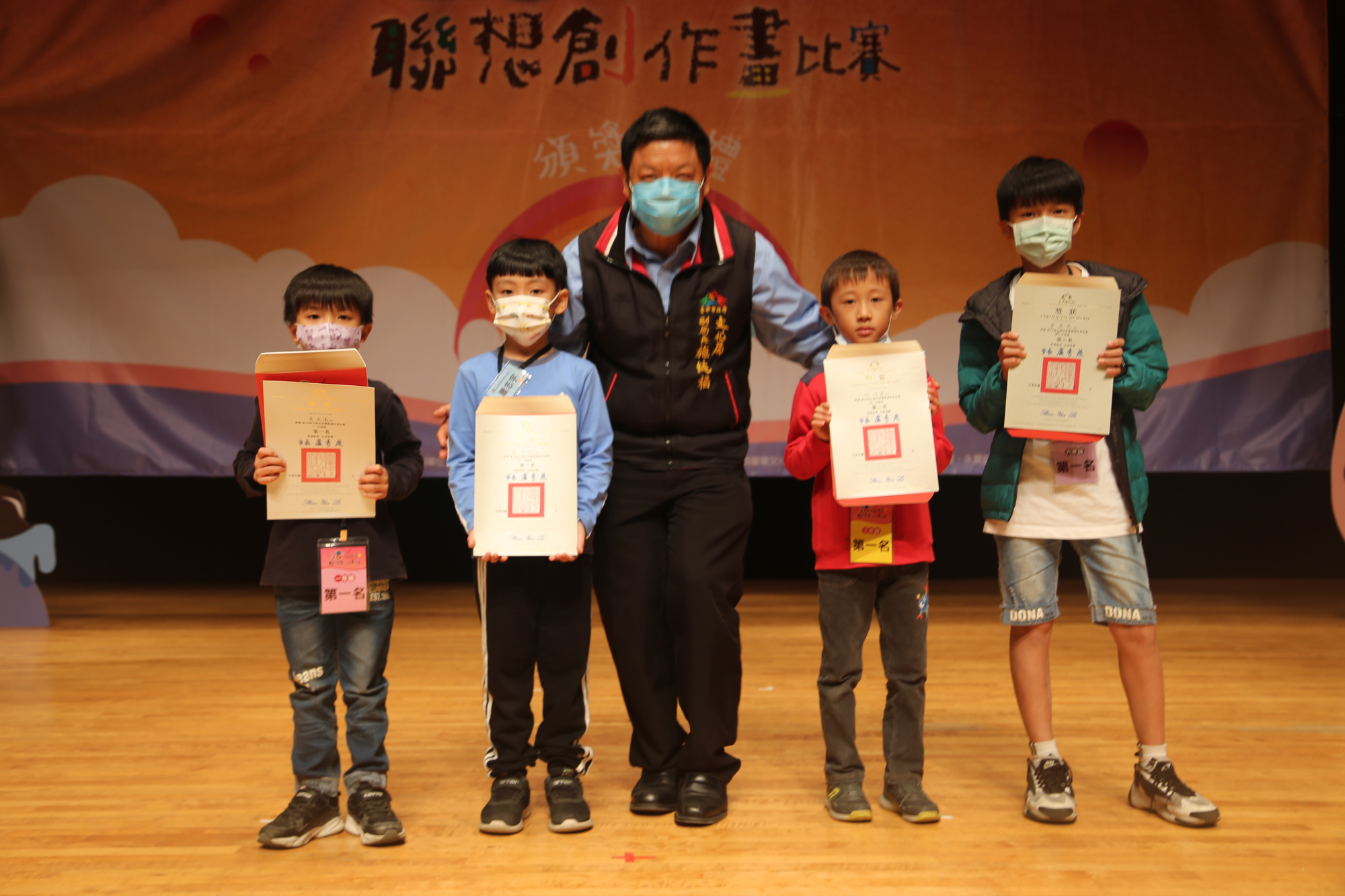 三年級林侑霆統合運用棕色及率性自由的波動流暢線條,主題及背景完美相融;四年級呂以正善用互補對立的強烈色彩,展現如馬締斯名畫的風格;五年級蔡旻志以漸層紅彩表現后羿射日的滾動炙熱烈焰,簡練的山景線條,塑造出色彩渾厚的和諧美感;六年級李奕杰以向外延伸線條的章魚為核心,輕重濃淡色彩處理的超強功力,揮灑出深不可測的海底世界。