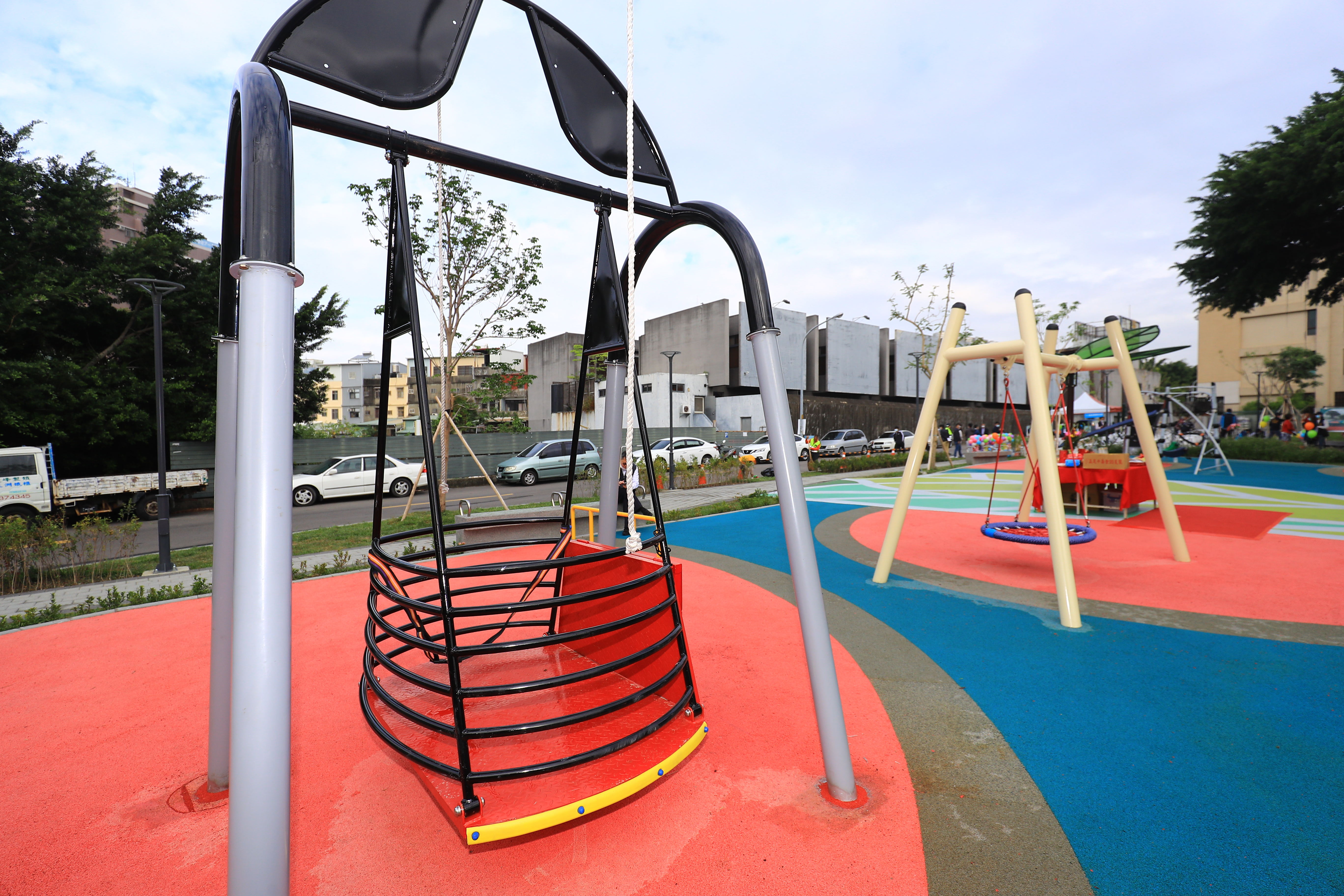 閒置荒地變身美麗公園!烏日溪邊公園用地原為閒置綠地,台中市政府建設局投入935萬元經費,導入「台中美樂地」計畫,建置無障礙環境及共融遊戲場,園內分為探險森林區、樂齡體健區、榕樹林蔭區,與公園內既有老榕樹共生發展,市長盧秀燕今(11)日主持啟用儀式,與居民見證這座跨齡、身障友善的共融公園誕生。