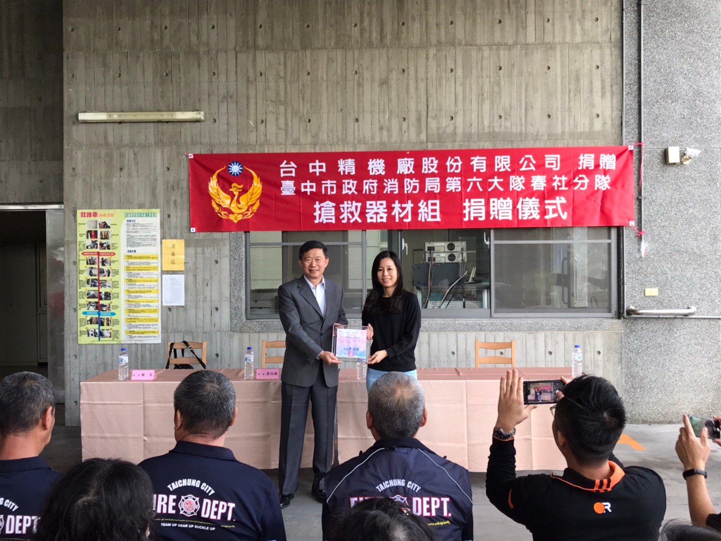 台中精機廠股份有限公司有感於消防弟兄辛勞,今(11)日捐贈台中市政府消防局春社分隊消防救助鞋20雙,價值約17萬元,由該公司特助黃怡穎代為致贈,第六救災救護大隊大隊長潘德倉代表受贈並回贈感謝狀,感謝企業熱心相挺,將愛心化為實際行動,提升消防員救災能量,消防局將持續善用設備,守護市民安全。
