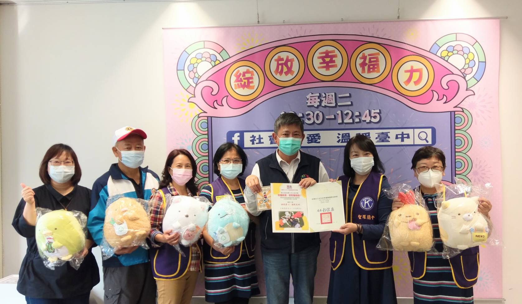 彭局長表示,分享愛與溫暖,市府整合民間與政府資源,將各界關懷一一送到安置機構孩子手上,台中市聖羅蘭國際同濟會得知市府將舉辦弱勢兒少耶誕活動,立刻提供6款最受孩子歡迎的角落生物抱枕當作禮物,希望孩子收到布偶後,作為傾訴陪伴對象,協助孩子紓解壓力、撫慰離家的心情。