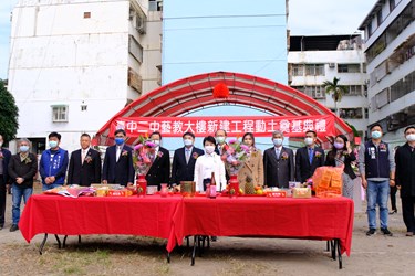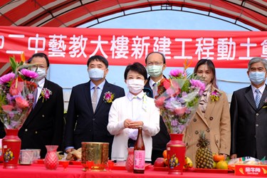 台中市立台中第二高級中等學校今(17)日舉行「藝教大樓新建工程動土奠基典禮」,由市長盧秀燕擔任主典者,與促成二中藝教大樓的薛光豐、何富財二位歷任校長及現任許耀文校長,共同慶祝藝教大樓順利動土,並預祝工程圓滿順利。盧市長表示,很高興見證二中「美夢成真!」,相信未來藝教大樓落成後,將提供學生、鄰近居民更好的學習環境及空間。