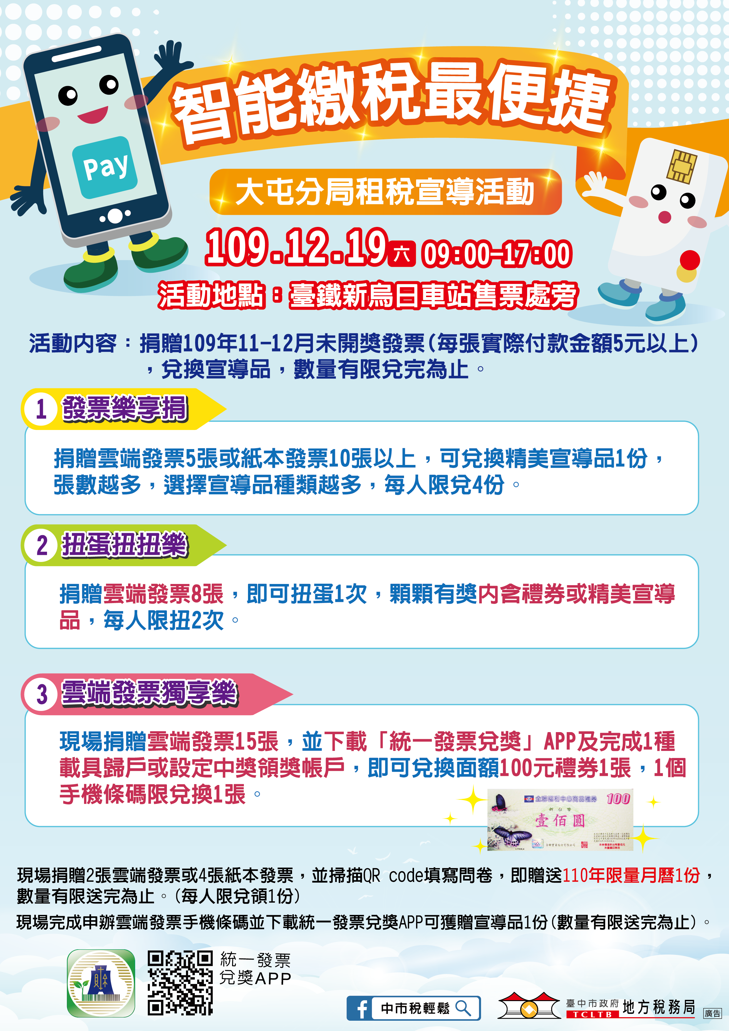 此外,現場完成「財政部統一發票兌獎APP」下載、歸戶載具或設定中獎領獎帳戶,即可兌換面額100元禮券1張,首次申辦APP再贈精美小禮,數量有限,兌完為止。如想進一步瞭解活動詳情,可利用免費電話0800-000321或04-22585000按1轉接全智慧客服中心,將有專人提供服務。(12/18*14)*稅務局