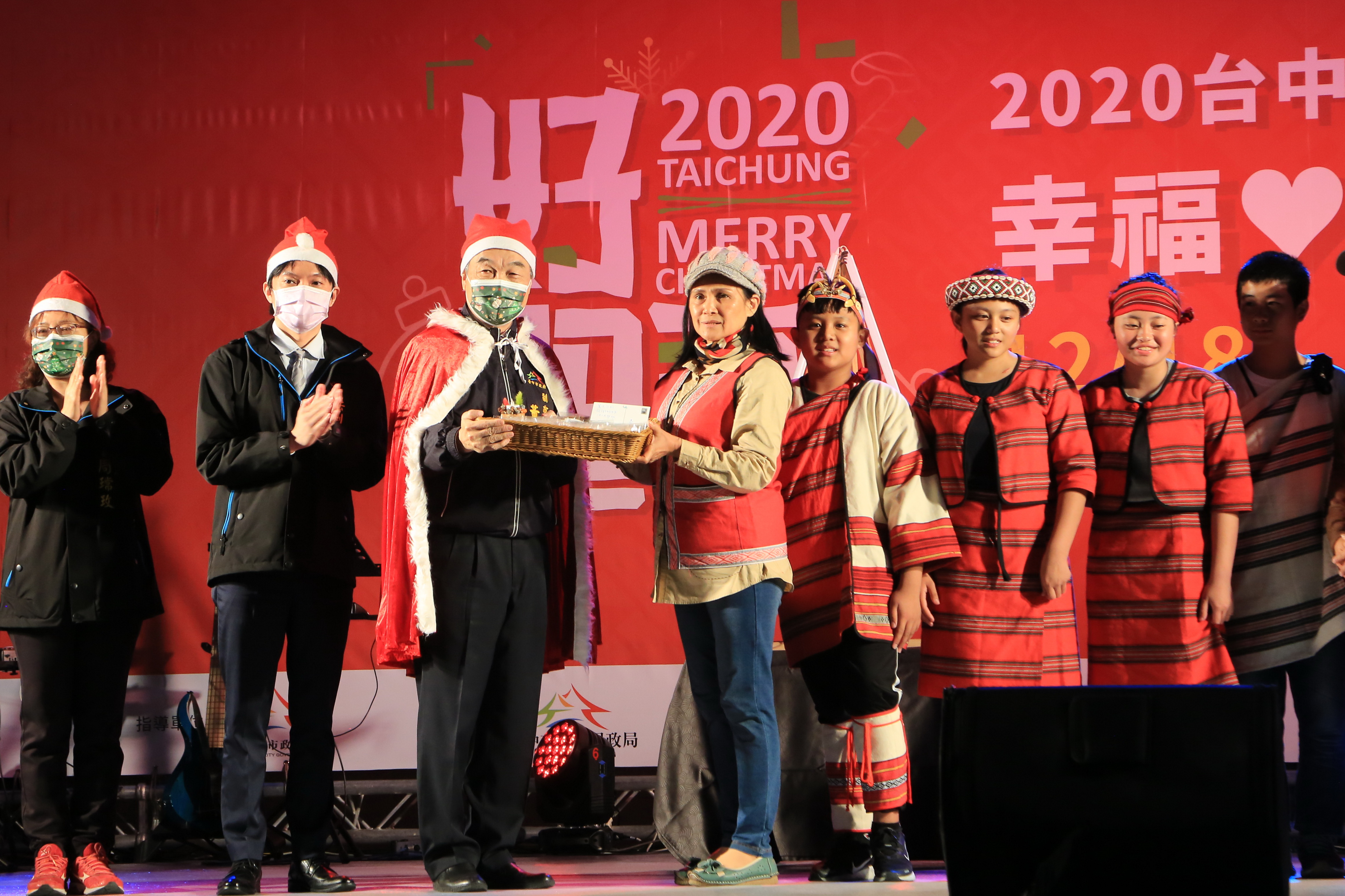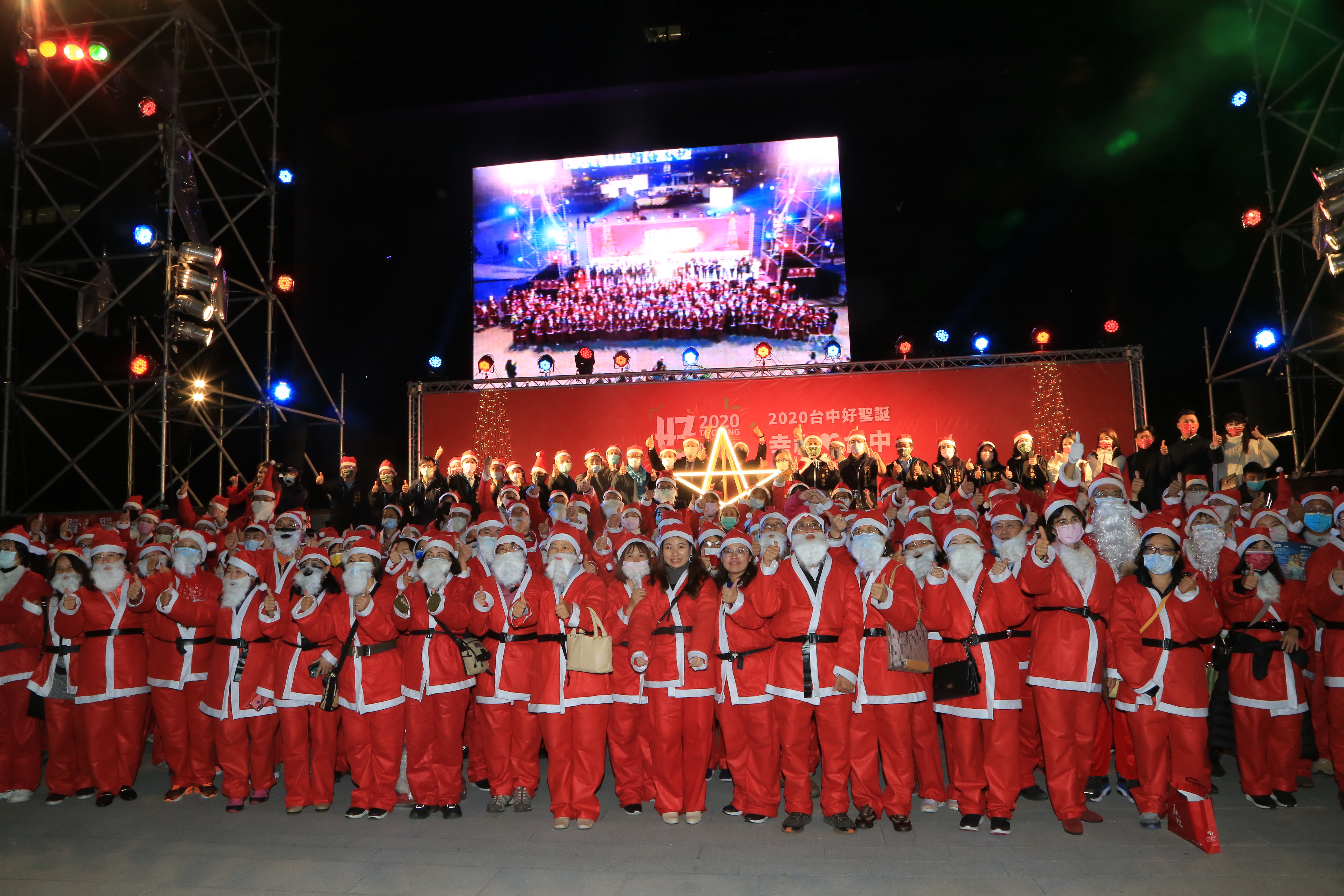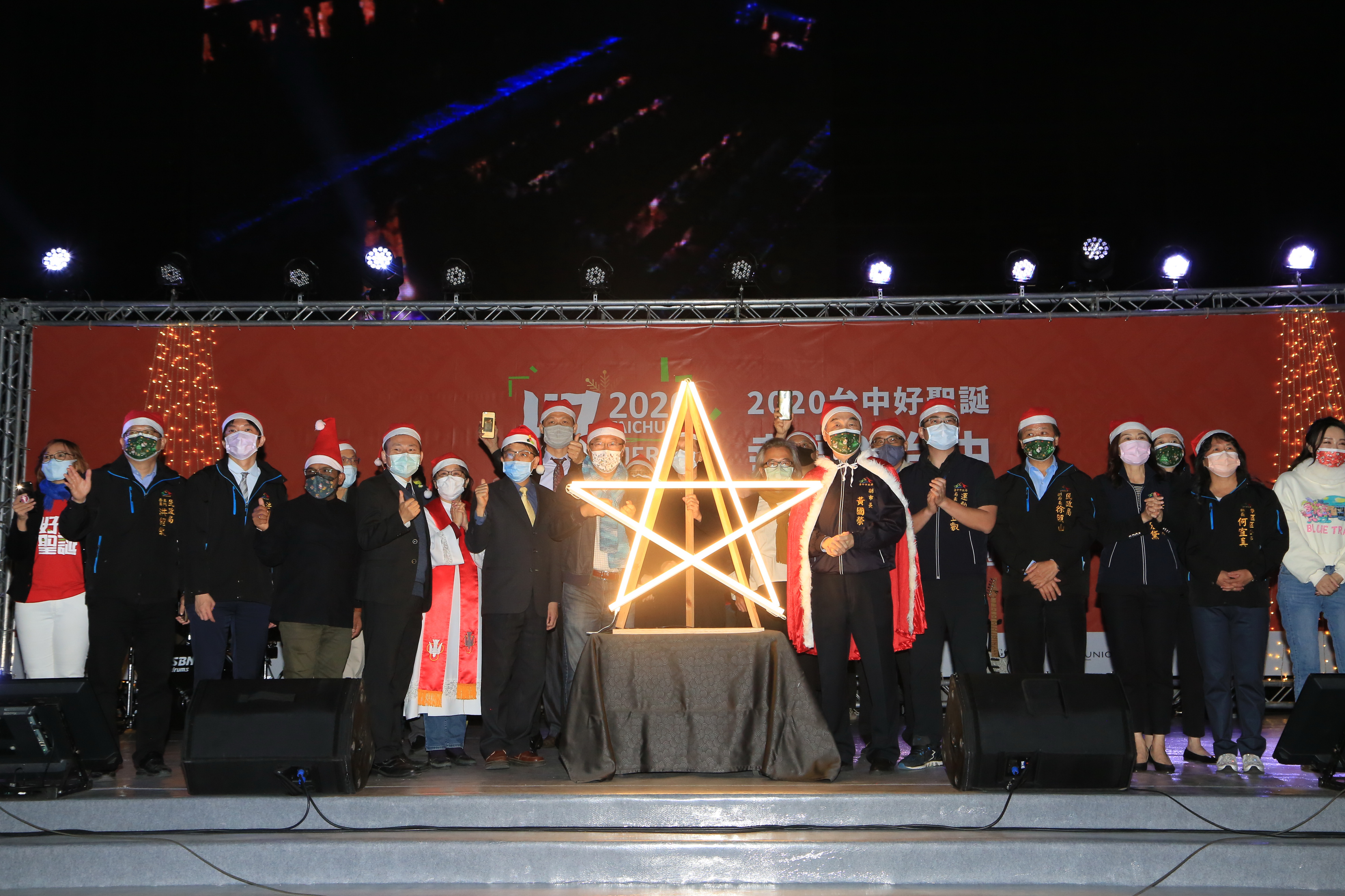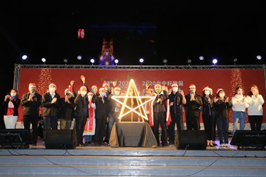 台中市政府民政局攜手台中市沐風關懷協會及台中市眾教會,即日起至12月24日舉辦「2020台中好聖誕」,今(18)晚八點於台中市政府府前廣場盛大點燈,副市長黃國榮出席與台下200名扮成聖誕老公公的民眾及現場大小朋友一同倒數,攜手點亮12米高、以8支孟宗竹集結打造的聖誕主樹「伯利恆之星」,為城市禱告平安與祝福。黃副市長表示,2020年全球受新冠肺炎疫情影響,所有人都度過辛苦的一年,希望在歲末的時候,透過聖誕喜慶氛圍,帶給大家更多溫暖。