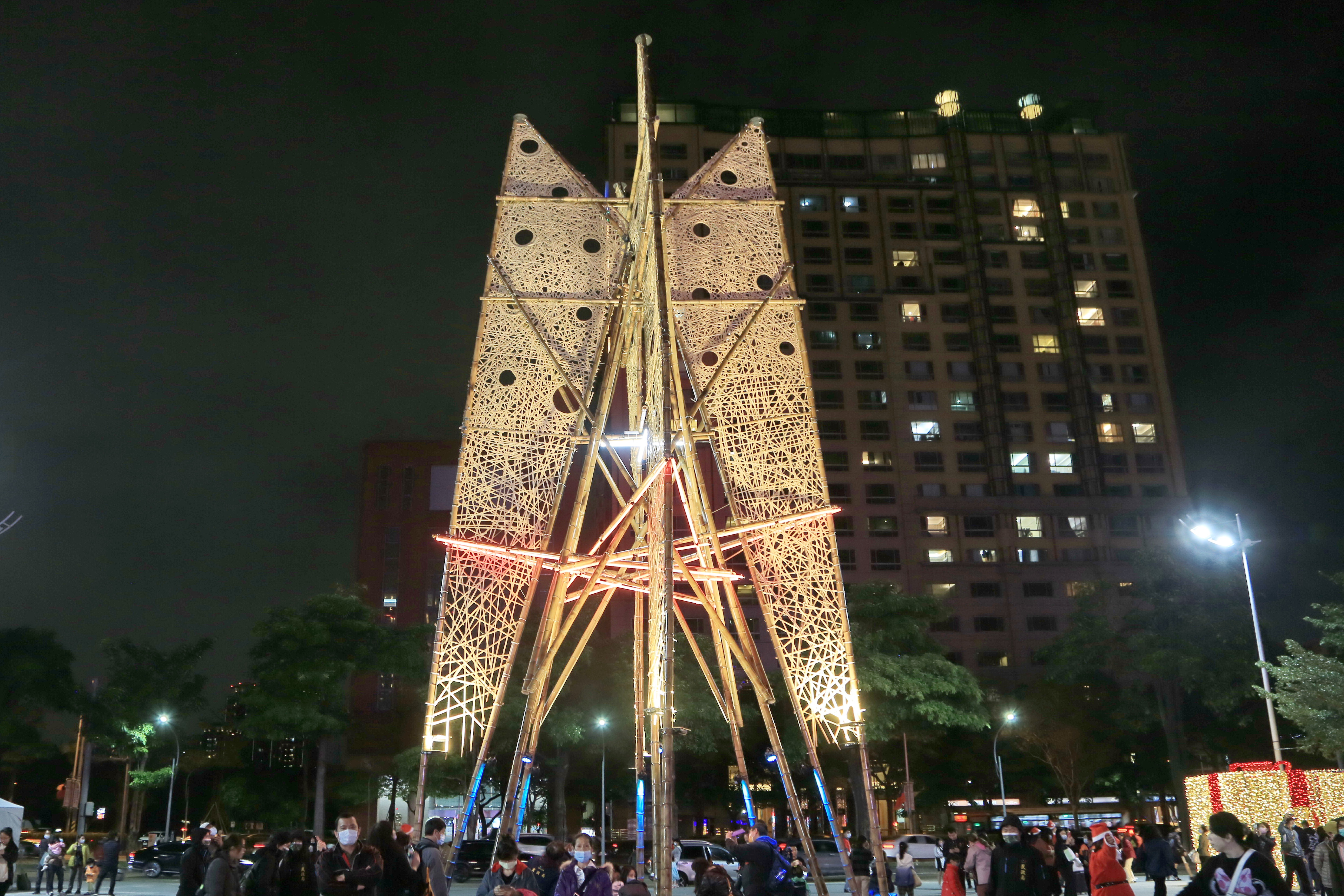 民政局表示,此次聖誕樹主燈,將聖誕節意象結合公共藝術,以簡約、現代、時尚風格呈現,形成與眾不同的特殊聖誕風格,竹藝聖誕樹樹體中央採中空設計,讓民眾可從四面八方進入樹中央內拍照打卡,不同於以往的新視覺焦點,勢必會成為台中好聖誕的新亮點。