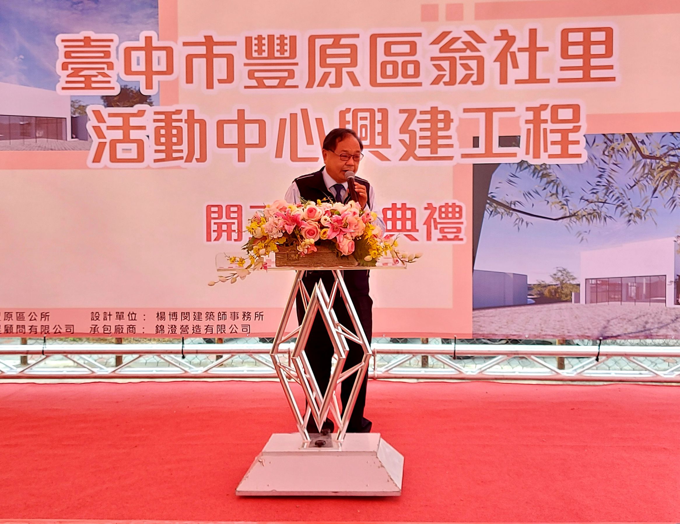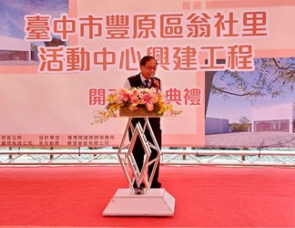 台中市豐原區公所今(21)日舉行翁社里活動中心新建工程動土開工典禮,工程投入經費1,978萬元,規劃地上3層建築物,設立服務中心及活動教室,滿足居民多元需求,預計110年底完工。台中市政府民政局長吳世瑋代表市長盧秀燕出席典禮表示,市府將持續活化當地設施,提供市民多元且優質的休憩空間。