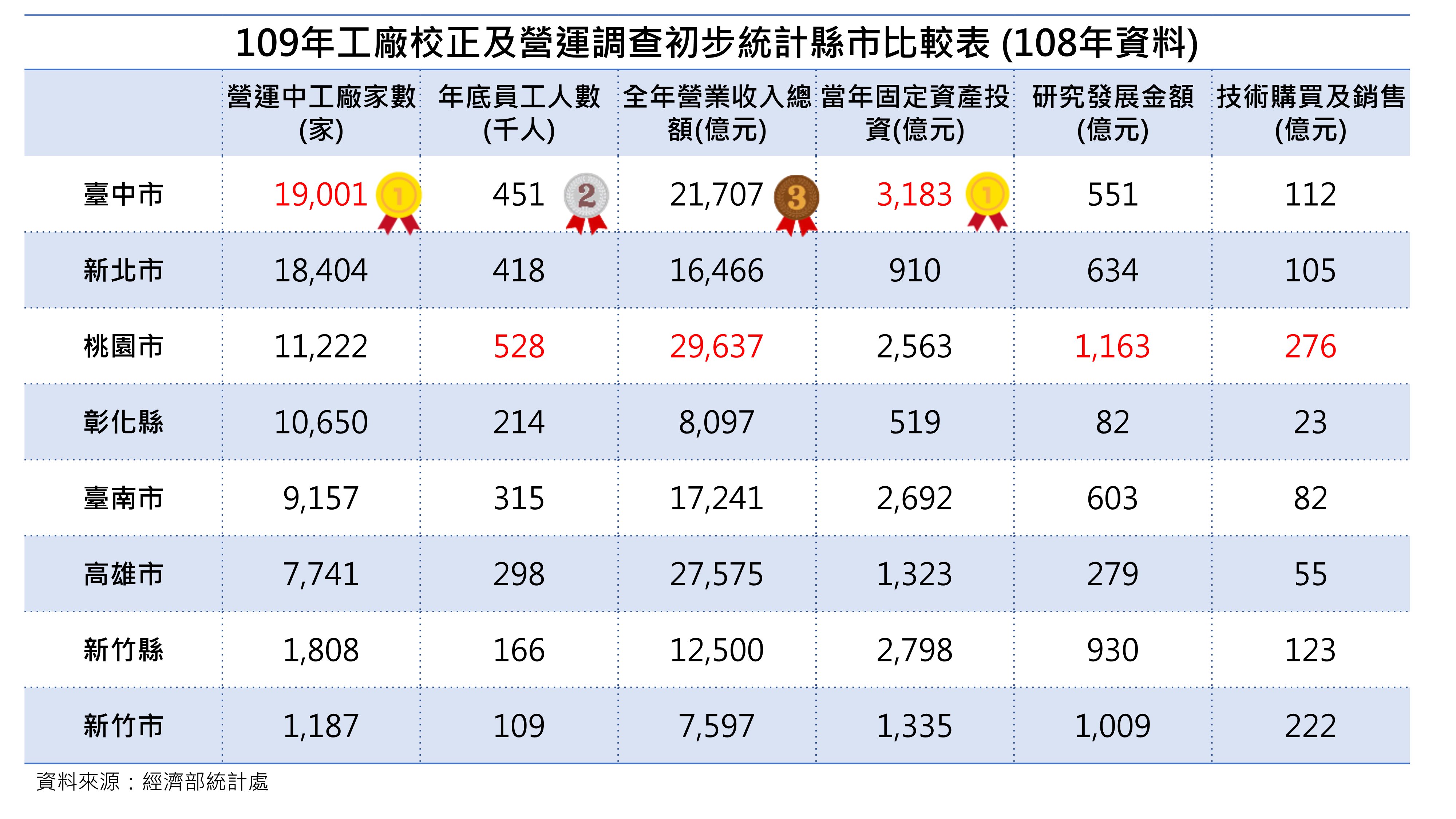經濟部統計處最新公布去年「工廠校正及營運調查」,台中市工廠營運家數1萬9,001家,家數佔全台21%,為全國工廠家數最多,台中廠商持續擴大投資及增加產能,固定資產投資額達3,183億元,金額全台第一,呼應台中「台灣製造產業重鎮」稱號。