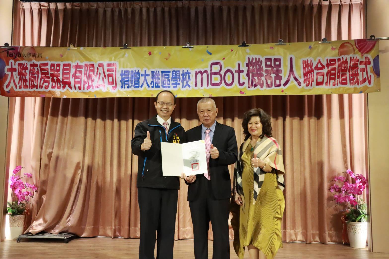 台中市政府教育局105年起與大雅廚具合作,並在台中市議員吳顯森促成下,推動「機器人教育課程」。為提升學習成效,大雅廚具董事長張光男熱心捐贈180萬元給大雅與后里區共18所學校,加上教育局補助180萬元購買教學設備,讓學生學習Scratch程式設計、數學與計算知識。教育局長楊振昇昨(23)日頒發感謝狀,肯定張董事長為教育的付出,張董事長另額外再捐贈惠明盲校及上楓國小棒球隊20萬元,藉此鼓勵更多企業投入教育資源。