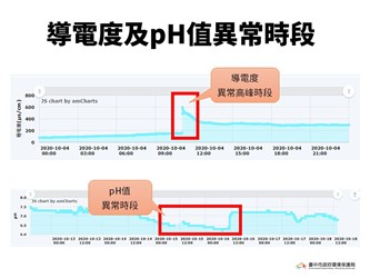 環保局表示,市府今年與環保署合作執行台灣智慧水聯網計畫,由中央研發水盒子、地方政府布建,市府優先篩選出高污染潛勢事業,其中一處鎖定豐原區民眾常陳情河段,於此處一電鍍業放流口下游設置水盒子,監測結果顯示導電度近中午時段出現異常高值,環保局稽查人員掌握違法排放週期後,輔以雲端監視器協助蒐證,一舉查獲此電鍍業偷排廢水,其放流水導電度數值高達6,630μS/cm,懸浮固體及化學需氧量皆超過放流水標準,後續依法告發處分。