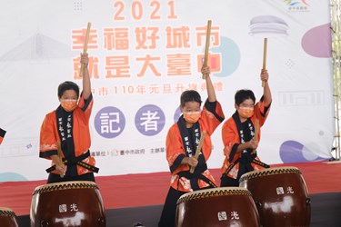 今日宣傳記者會由國光國小鼓藝社氣勢磅礡的演出揭曉序幕,台中家商服裝科同學帶來國旗裝走秀,這次展示服裝為今年台中市各區公所創意國旗裝競賽中前3名(東區、外埔區)作品,另小小禮兵孫孫也帶來操槍表演,一一揭曉台中110年元旦亮點。包含民政局副局長徐照山、周瑺玫、東區區長何宜真、南區區長陳佩玉、龍井區長戴燕如等及各區代表均到場共襄盛舉。