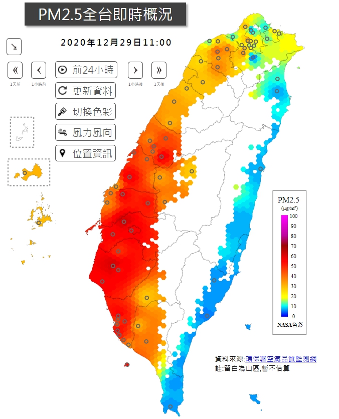 環保局提醒,明日鋒面通過及寒流南下,仍須留意境外污染物影響,建議敏感族群或老人、小孩等抵抗力較弱者,減少戶外劇烈活動並佩戴口罩防護,預計12月31日起,中部地區擴散條件將轉佳。(12/29*3)*環保局