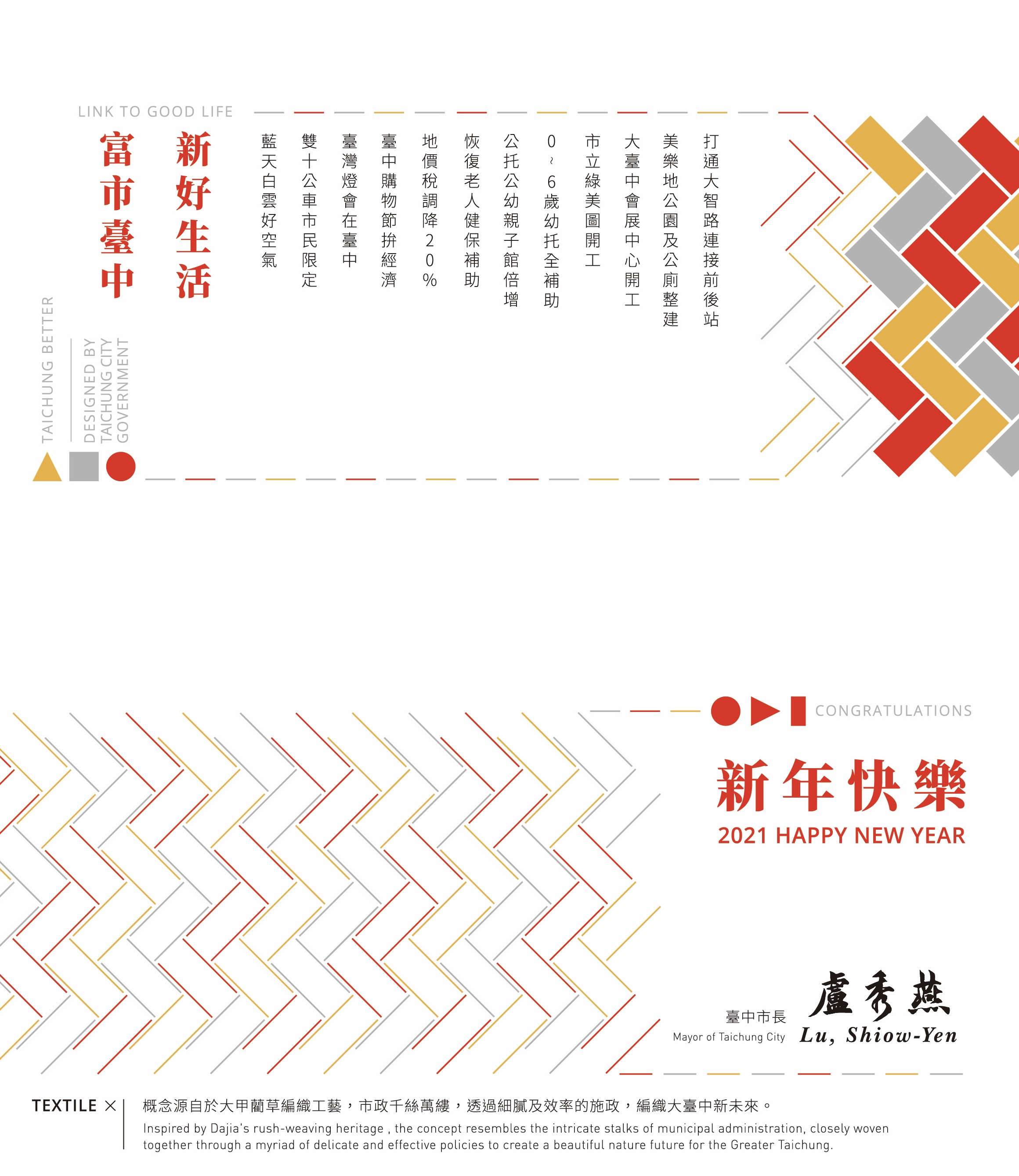 迎接嶄新金牛年,台中市政府設計市長新年賀卡,向市民遞上12大政績與祝福。今年賀卡以大甲藺草編織工藝為意象,連結早期女性以細膩手工支撐生計的歷史過往,象徵市長盧秀燕面對市政千絲萬縷,仍秉持細心、耐心、效率,編織大台中未來。