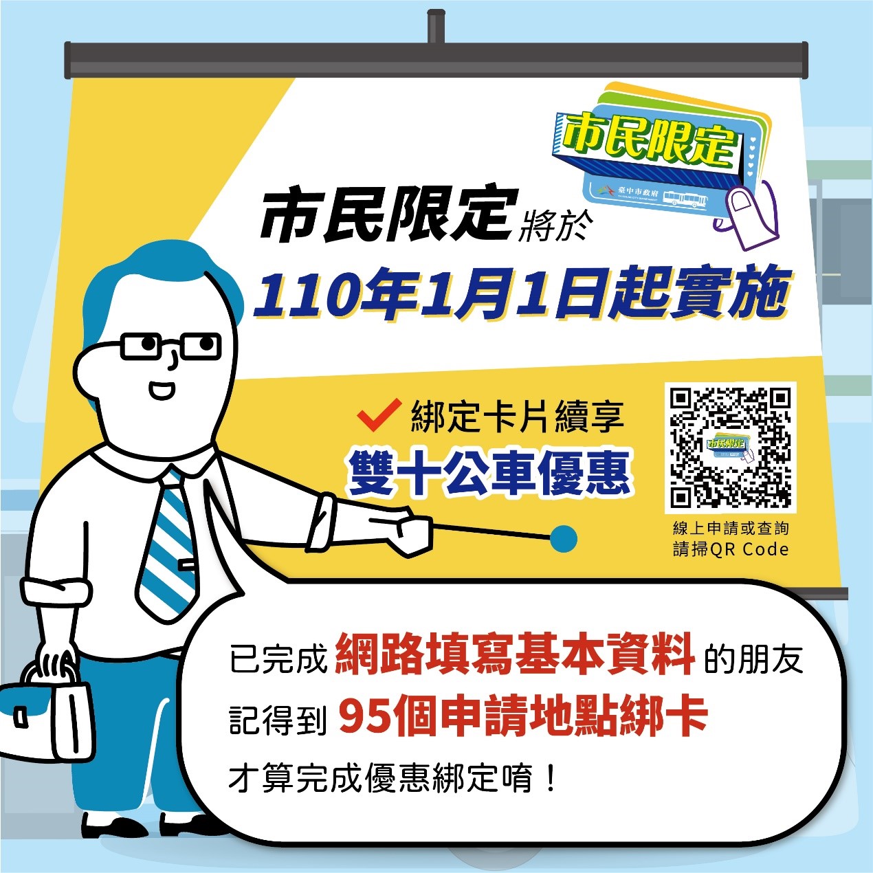 葉局長提醒,已在網路填妥「市民限定」申請資料但尚未完成靠卡綁定,請記得攜帶國民身分證及電子票證前往市府公布的95處申請地點靠卡,才算真正完成綁卡作業。政策上路後若持尚未綁定票卡上車將被扣款15元,後續再依實際搭乘距離於下車時扣款,請民眾特別留意!市民限定政策相關訊息可至市民限定網站( https://idoor.taichung.gov.tw/ )查詢。