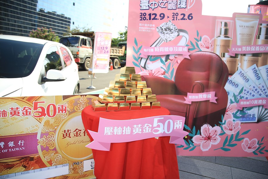 經發局說明,「2020台中女麗購」活動期間自去年129日至今年26日,期間舉行天天抽、週週抽、雙週抽、月月抽,民眾只需在台中任何店家消費滿額500元,並用「台中購物節」APP登錄發票,即可有機會抽鑽戒、汽車及最大獎黃金五十兩。