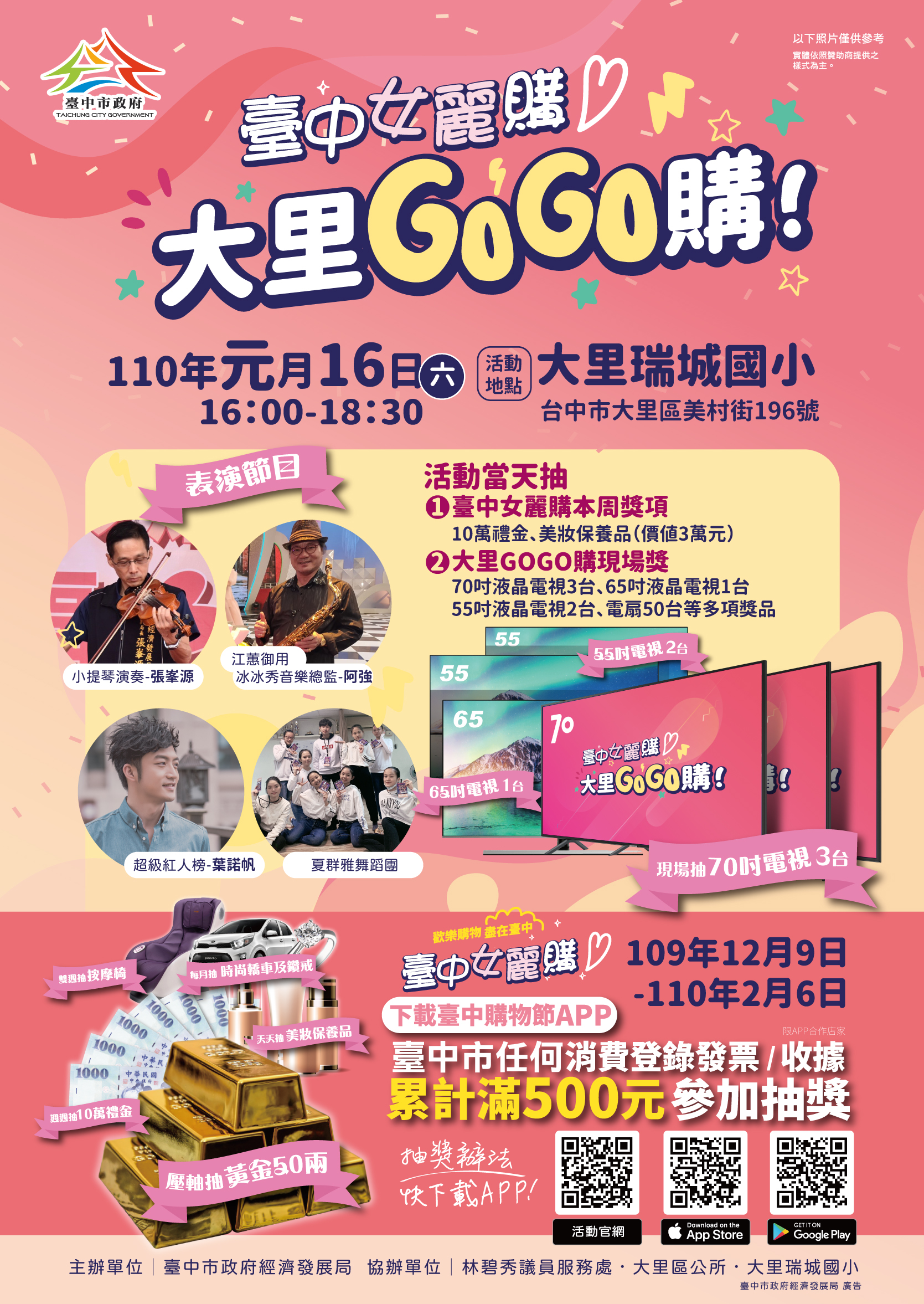 「大里GOGO購」活動由市議員林碧秀服務處、大里區瑞城國小等單位共同協辦,此外,活動現場也邀請知名歌手葉諾帆到場獻唱,還有江蕙御用薩克斯風手阿強老師、夏群雅舞蹈團及藝林舞團等表演接續上場表演,活動精采可期。