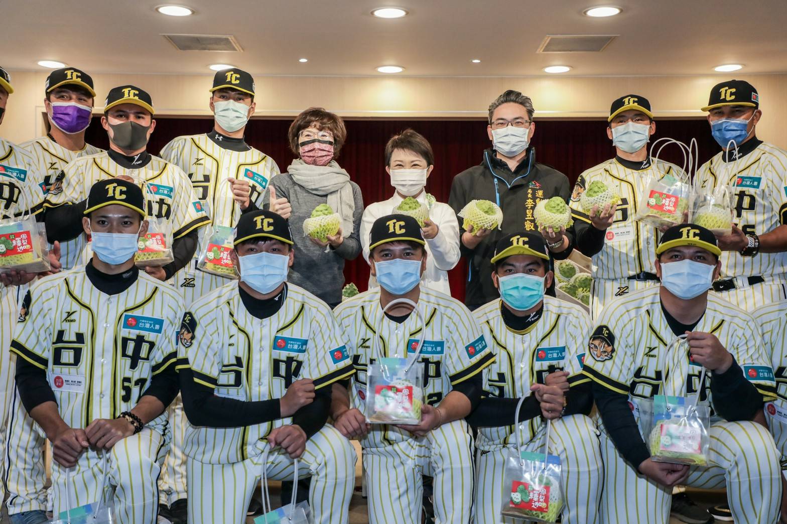 台東縣長饒慶鈴昨(15)日造訪台中市政府,感謝市長盧秀燕大力支持台東農產鳳梨釋迦,台中市城市棒球隊「臺中成棒隊」總教練張家浩、教練陽建福、鄭達鴻、曾華偉、楊承駿及球隊球員,也到場全力相挺,與市府共同推廣優質農產品。