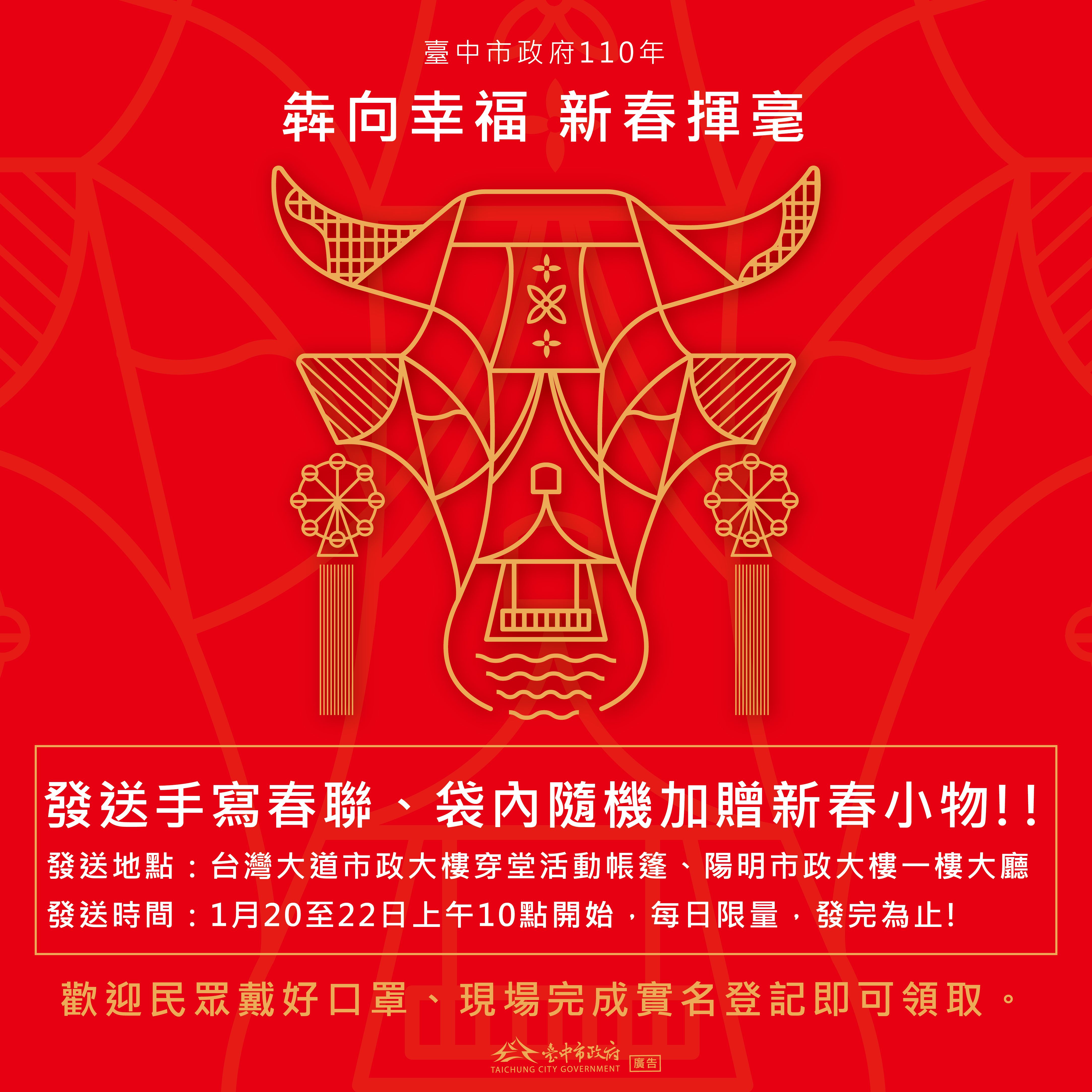 農曆新年即將到來,台中市政府每年均邀請各界書法家現場揮毫寫春聯,免費發送民眾,獲得廣大迴響。今年因應疫情,調整為提前請書法家寫好春聯,裝袋讓民眾領取,可於1月20至22日至台灣大道市政大樓1樓中央川堂及陽明市政大樓1樓大廳免費索取,將隨機加贈新春小物,請民眾配合現場防疫措施,數量有限,送完為止。