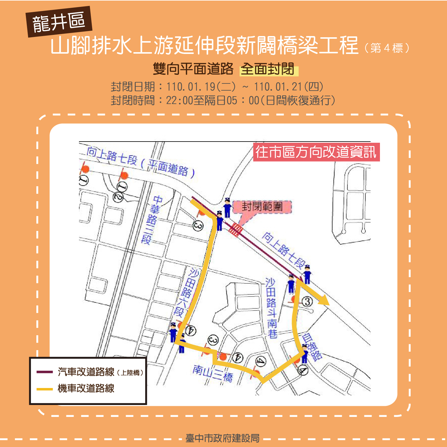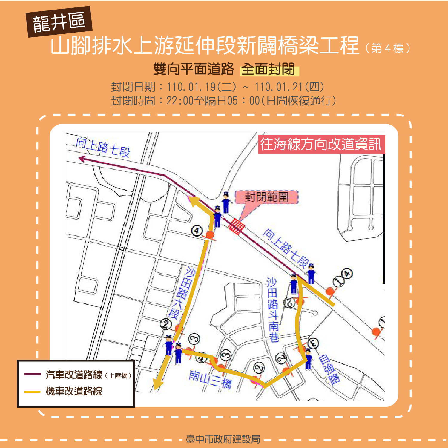 建設局長陳大田表示,該工程將自今日起至21日每天22時至隔日凌晨5時全面封閉向上路七段雙向平面道路,封閉期間,汽車可利用向上陸橋通行,機車請改走自強路等替代道路,請用路人減速慢行,聽從現場人員指揮,維護通行安全。
