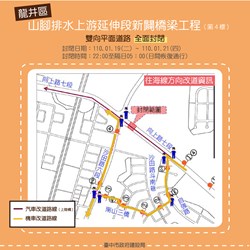 台中市政府與經濟部水利署合作推動「南山截水溝計畫」,盼解決沙鹿、梧棲、龍井等海線淹水問題,其中龍井區山腳排水上游延伸段新闢橋梁工程(第4標)採用四階段改道措施,工程進度穩定,預計今(19)晚10時實施夜間橋梁吊裝作業,將封閉向上路七段雙向平面道路(沙田路至自強路段),提醒用路人提前改道或依指引牌面行駛。
