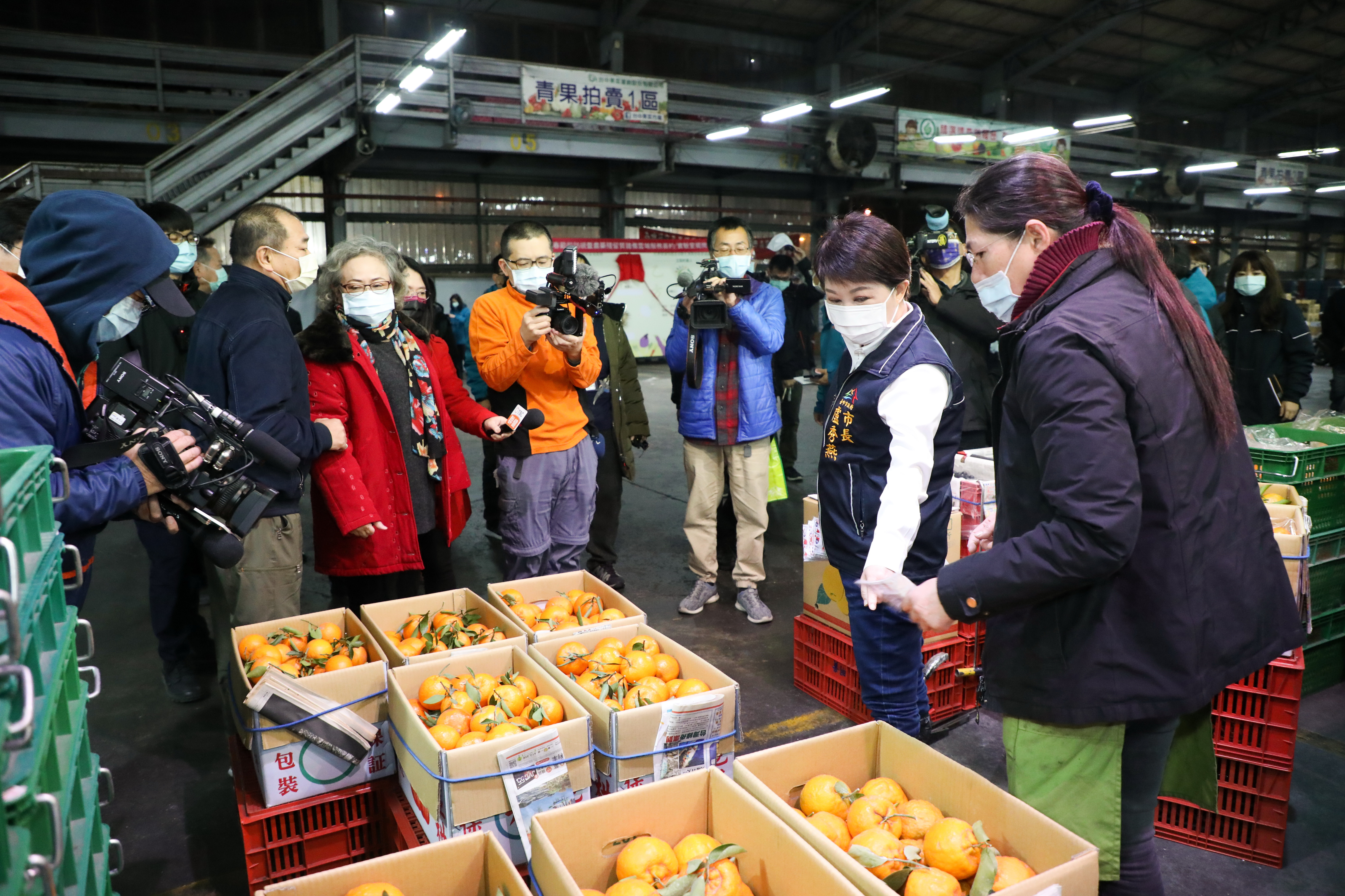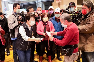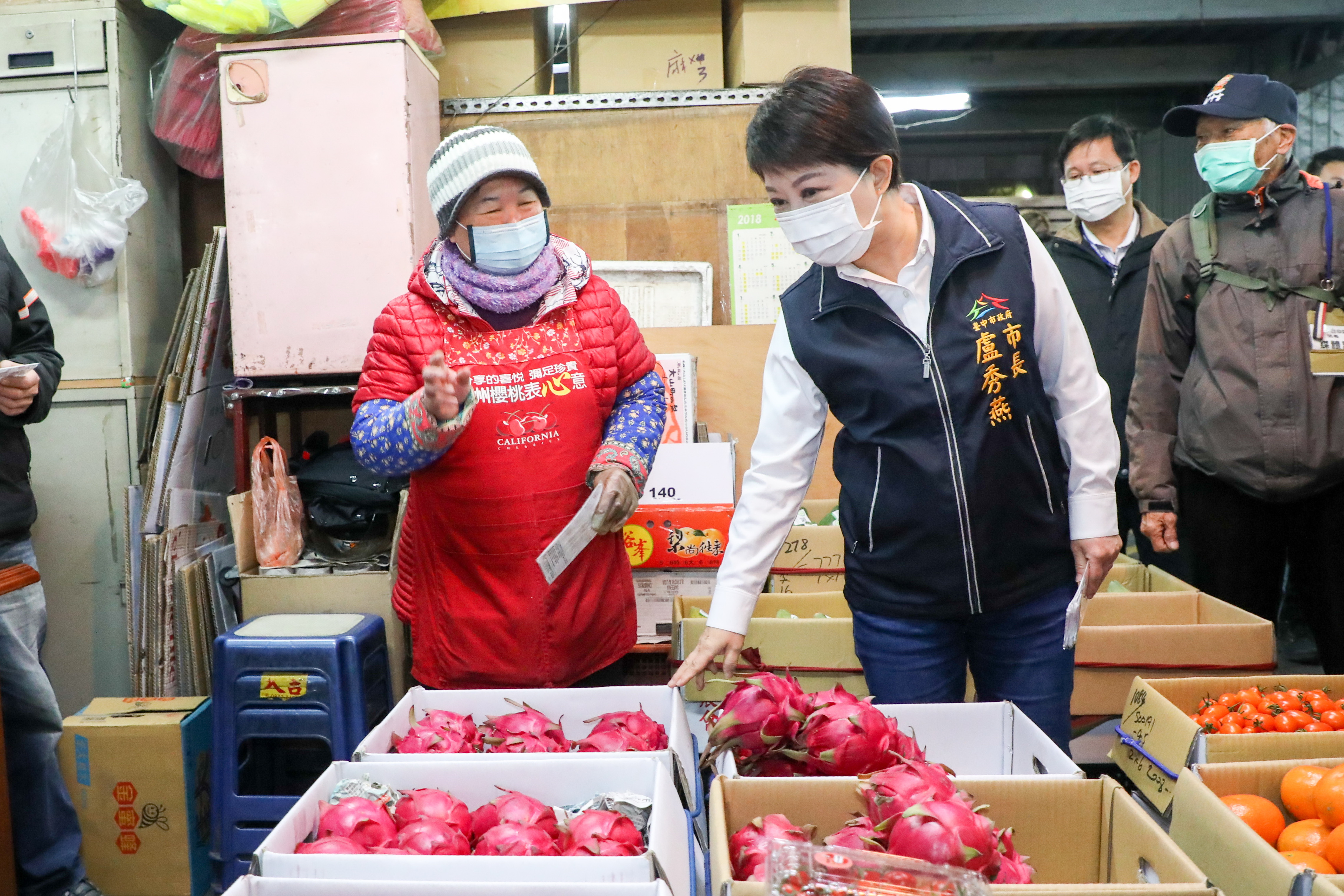 農曆新年將至,台中市長盧秀燕今(29)日凌晨天未亮接連前往台中魚市場與果菜批發市場視察了解防疫情形,並走訪關心魚貨及蔬果供銷,向攤商拜早年;盧市長表示,今年市場價格及供貨維持穩定,市民可以安心,而為防範疫情,市場加強各項防疫措施,包括實施量測體溫、手部消毒及全面戴口罩,積極守護員工及顧客健康。