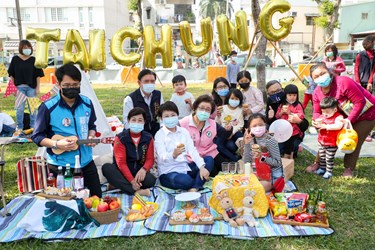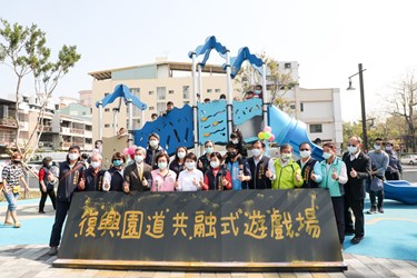 水利局今天舉行復興園道共融式遊戲場啟用典禮,盧市長出席與現場小朋友在草地上野餐、玩扮家家酒,並體驗遊具,從中了解水質淨化過程,小朋友們玩得不亦樂乎,氣氛開心熱鬧。