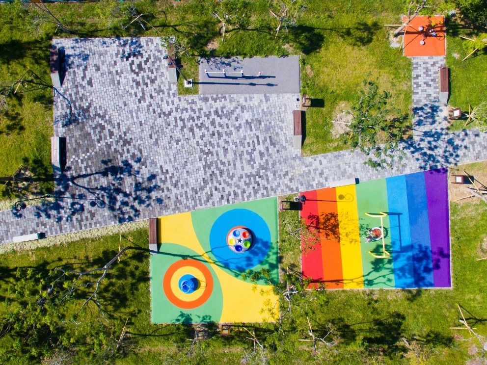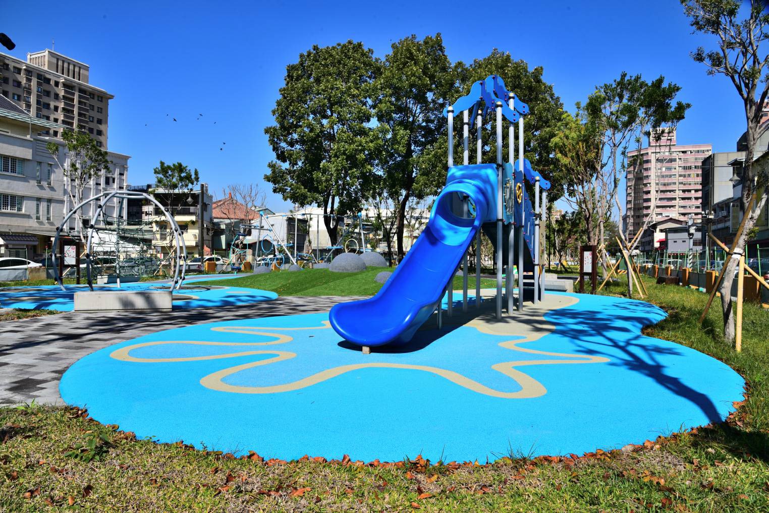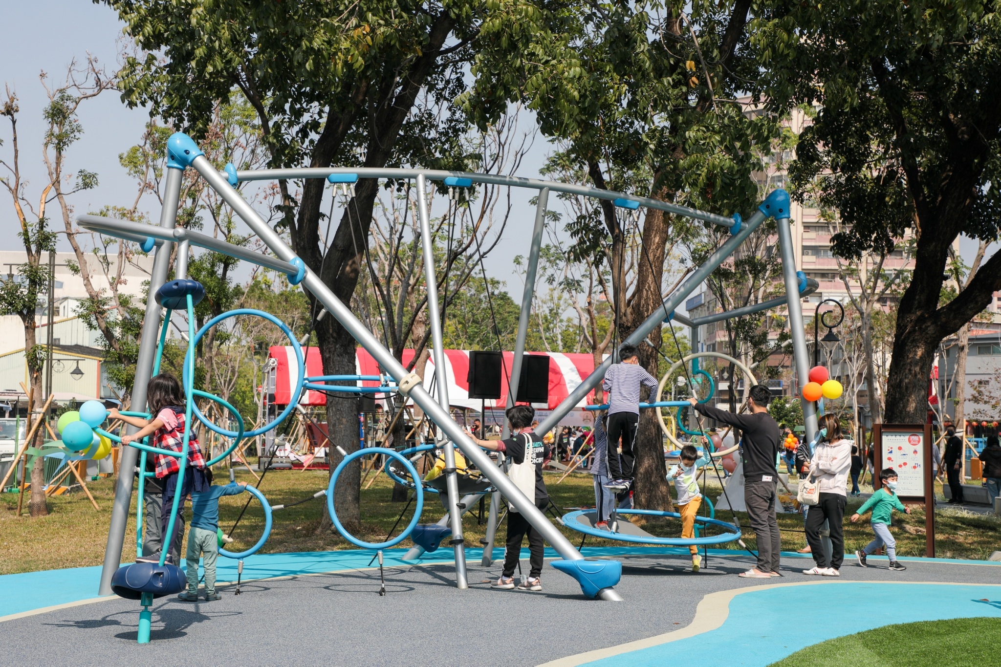 其中共融式遊戲場包含「綠川水淨樂園」主題式遊戲區、體健廣場、遊憩草坪、共遊區等豐富設施,友善設施讓小朋友與行動不便的孩童能一起共遊,大人、年長者也有相約跳舞、野餐的空間,每個人都能在遊戲場享受放鬆的自然氛圍。