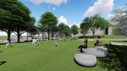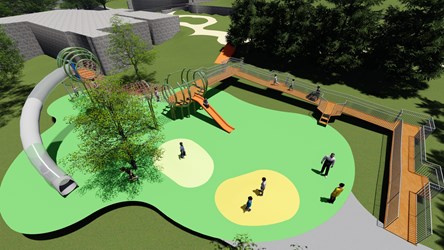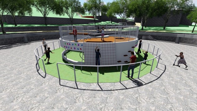 陳局長指出,改善工程導入台中美樂地計畫,運用既有地形設計蝴蝶意象的繭型造型滑梯、改造既有澄泥池為攀爬區、建置環狀無障礙步行系統,另以糕餅意象設計遊戲區周邊休憩平台,同時整頓停車場空間,整修漆藝館前既有停車場步道空間及鋪面,並設置中正公園10景導覽解說牌,強化在地歷史環境教育,營造有趣多元的公園場域。