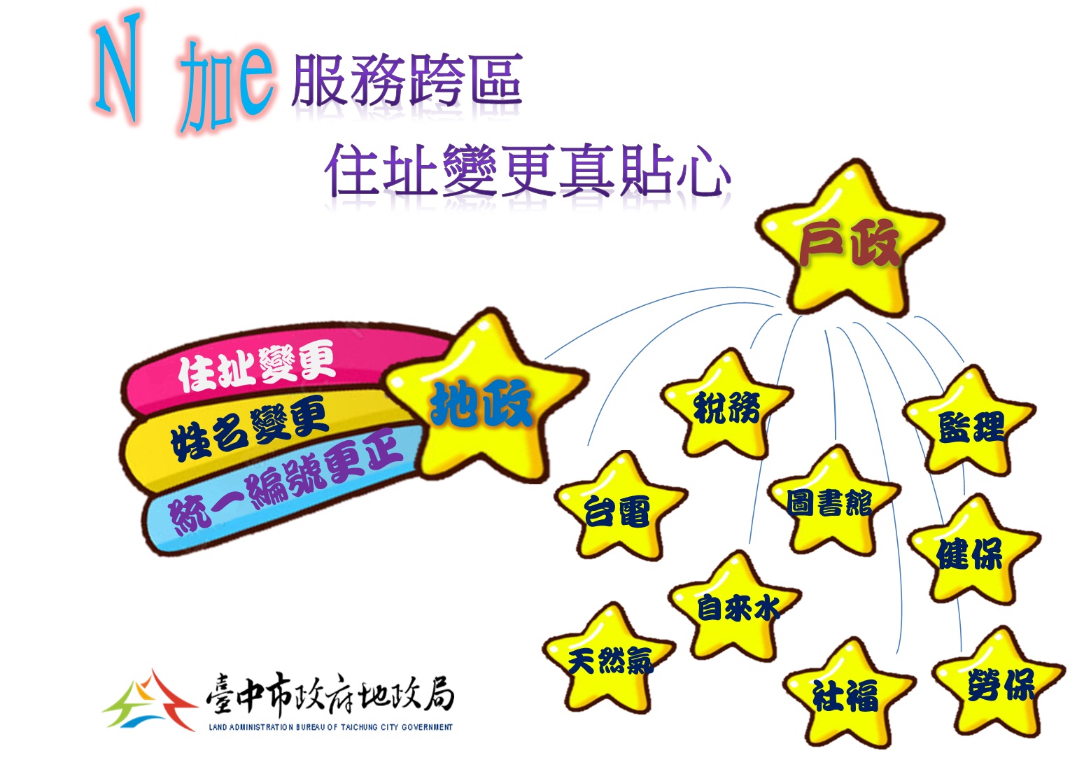 地政局指出,台中自102123日起,全國首創「Ne」跨機關便民服務,再配合內政部推動的「戶籍資料異動跨機關通報服務」,整合地政機關、稅務機關、監理機關、圖書館、台灣電力公司、自來水公司等單位,民眾如要進行住址變更、出生日期更正、國民身分證統一編號及姓名變更等,只要至台中各區戶政事務所完成相關戶籍登記更新,即可填寫申請表,其他服務機關將併同修改資料,省時省力又不漏通知。