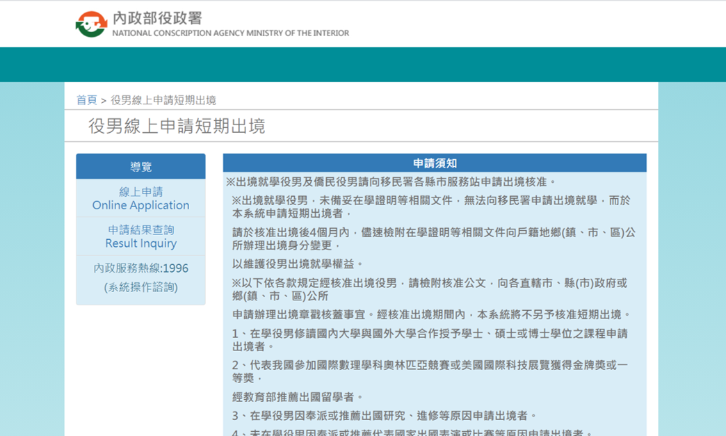 吳局長表示,為便利役男短期出境,內政部役政署已完成建置「役男短期出境線上申請作業系統」( https://www.ris.gov.tw/departure/main ),受理役男線上申請短期出境,欲出國役男請於出境前3日至30日完成出境申請。