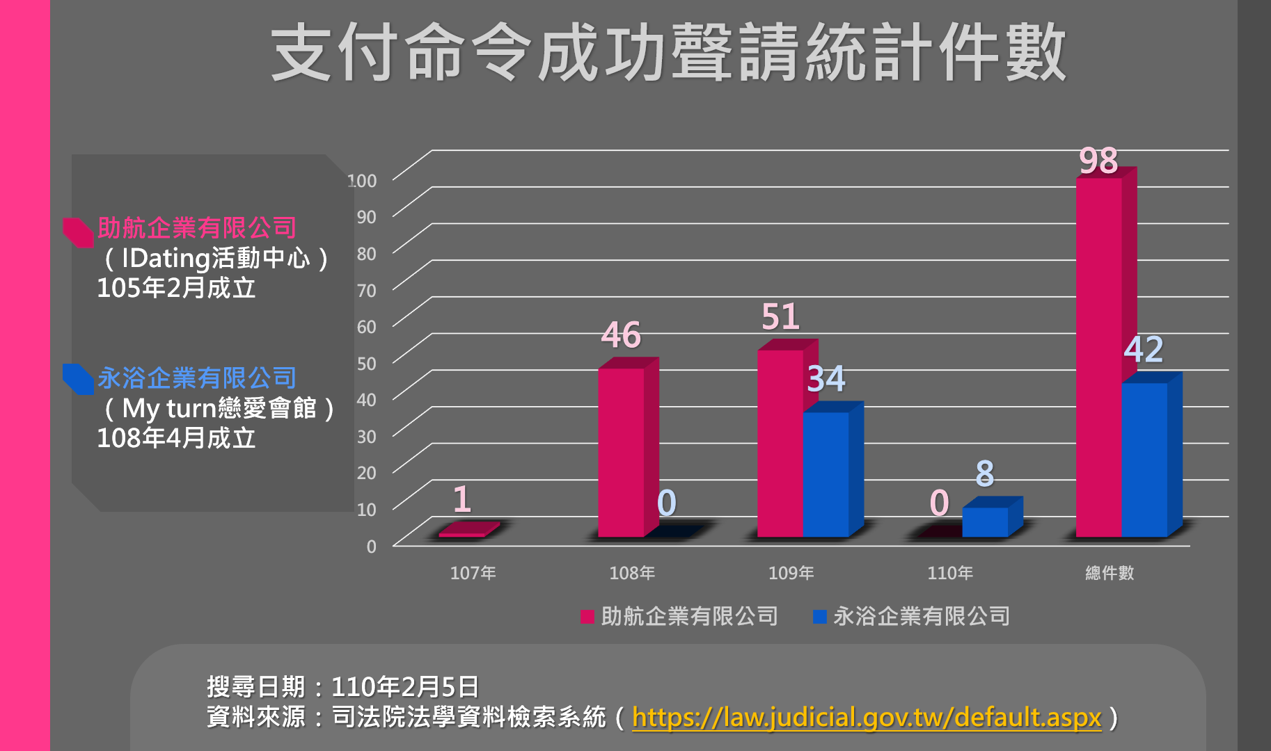 法制局表示近年來交友媒合服務衍生消費爭議的申訴案件持續增加,從107年51件、108年86件、109年88件,主要爭議多在於解除(終止)契約的違約金過高。經瞭解此類申訴案之消費者的締約經驗與爭議過程多與陳姓消費者相似。再查詢臺中地方法院公開資料,仲介交友業者對於已簽約的消費者,每年向法院成功聲請核發支付命令約40件,如消費者未依規定聲明異議,業者即可聲請對消費者的財產強制執行。此時,縱消費者提起消費申訴,但業者手握債權故協商意願低,雙方更難以達成和解,建議使用交友平台的民眾,對此應保持警覺。