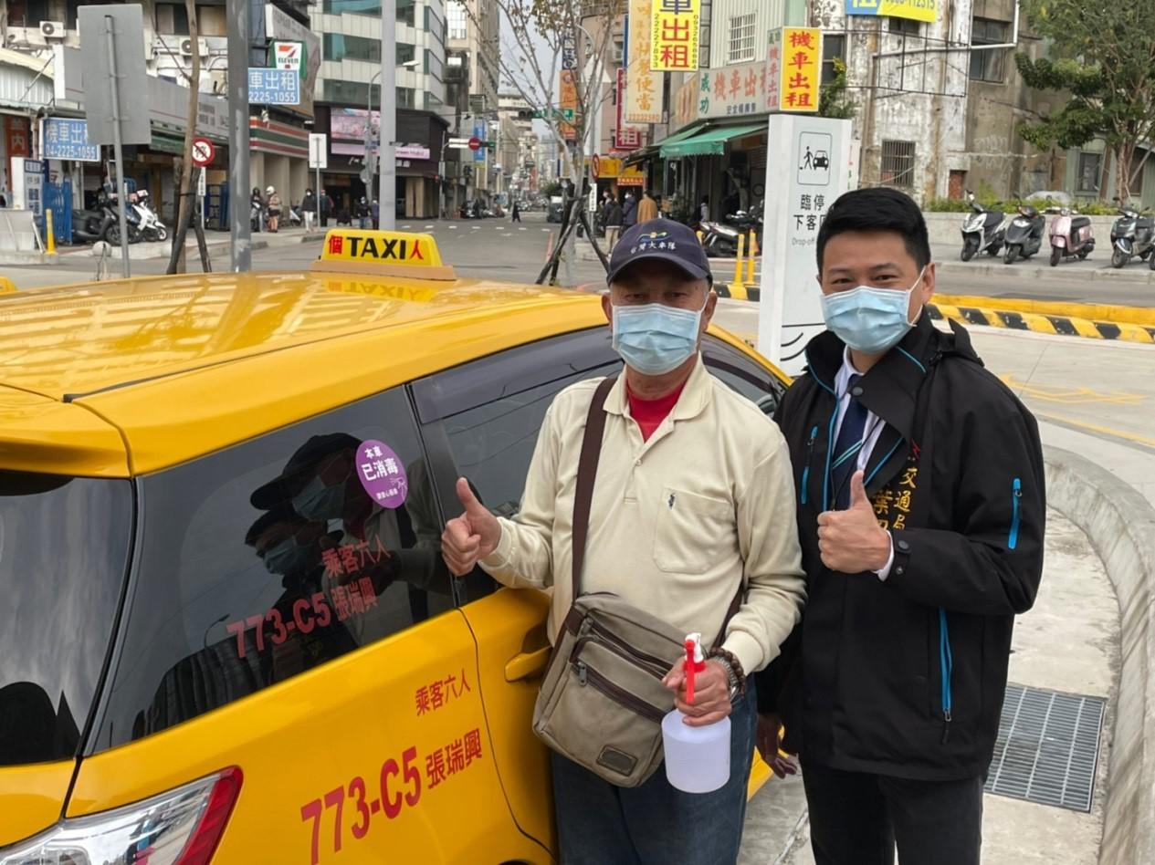春節連假即將到來,因應返鄉、採買、走春人潮,交通局長葉昭甫日前至台中火車站關心計程車防疫狀況,向計程車駕駛及民眾宣導乘車全程佩戴口罩防疫規定,交通局也持續發放次氯酸水讓計程車駕駛自主消毒車輛,已完成消毒的車子並貼上印有「本車已消毒」的紫色貼紙,讓乘客安心搭乘。