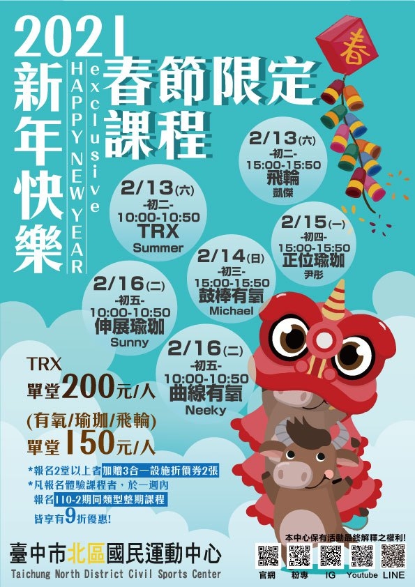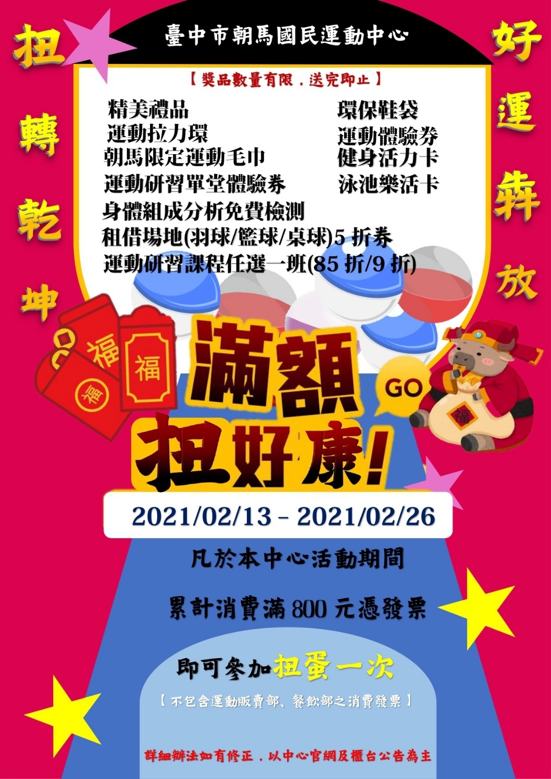 運動局說明,朝馬國民運動中心於2月13至26日推出「滿額扭(牛)好康」活動,活動期間憑800元以上發票即可參加扭蛋活動,獎品包含拉力環、身體組成分析免費檢測、運動體驗券、場租或課程折價券等;北區國民運動中心則已先祭出「牛轉錢坤抽紅包」優惠方案,提供活動期間報名指定課程就有機會抽出好禮活動,活動已於日前截止,廣獲;北區國民運動中心加碼再推出多項春節限定課程,自2月13至16日期間有飛輪、正位瑜珈、鼓棒有氧、TRX等豐富內容。