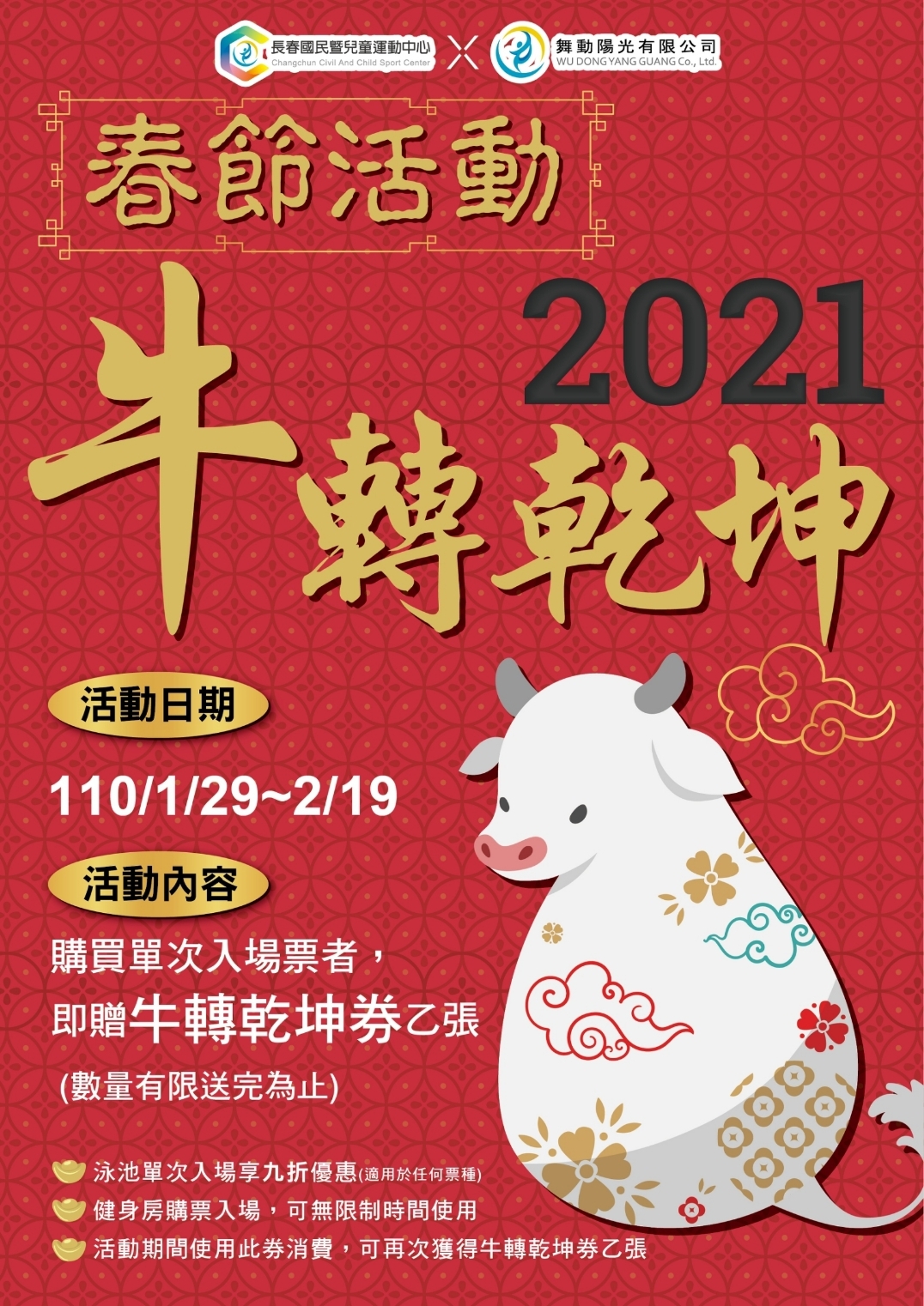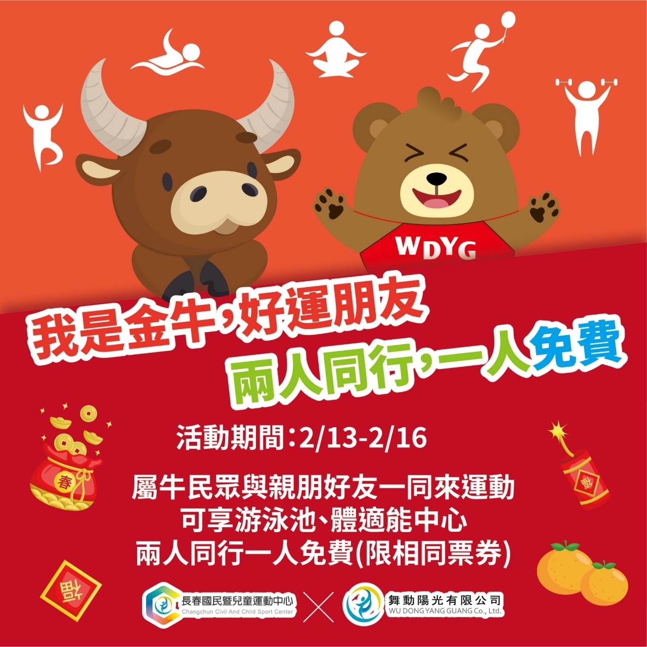 此外,長春國民暨兒童運動中心則邀請生肖「屬牛」的市民朋友相約親友一同運動,自2月13至16日期間使用泳池或健身房可享「兩人同行、一人免費」優惠,此外,即日起至2月19日凡購買該中心游泳池或健身房單次入場票者將贈送「牛轉乾坤券」一張(數量有限送完為止),憑券可獲泳池單次入場票享9折優惠或享健身房單次入場票無使用時間限制一次。