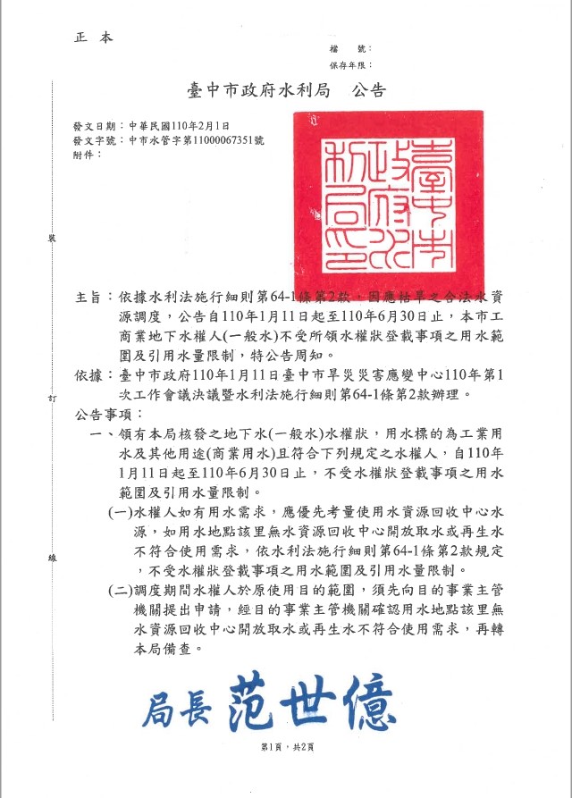 因應臺中市水情燈號轉為減量供水橙燈,為減少自來水用量與民眾共體時艱,臺中市政府水利局配合臺中市旱災災害應變中心公告臺中市工商業地下水之水權人自110111日起至110630日止,有增量用水需求須先向目的事業主管機關提出申請,經主管機關確認用水地點該里無水資源回收中心開放取水及再生水源不符合需求後,再經水利局備查後,即可於上述調度期間不受所領水權狀登載事項(用水範圍及引用水量)之限制。