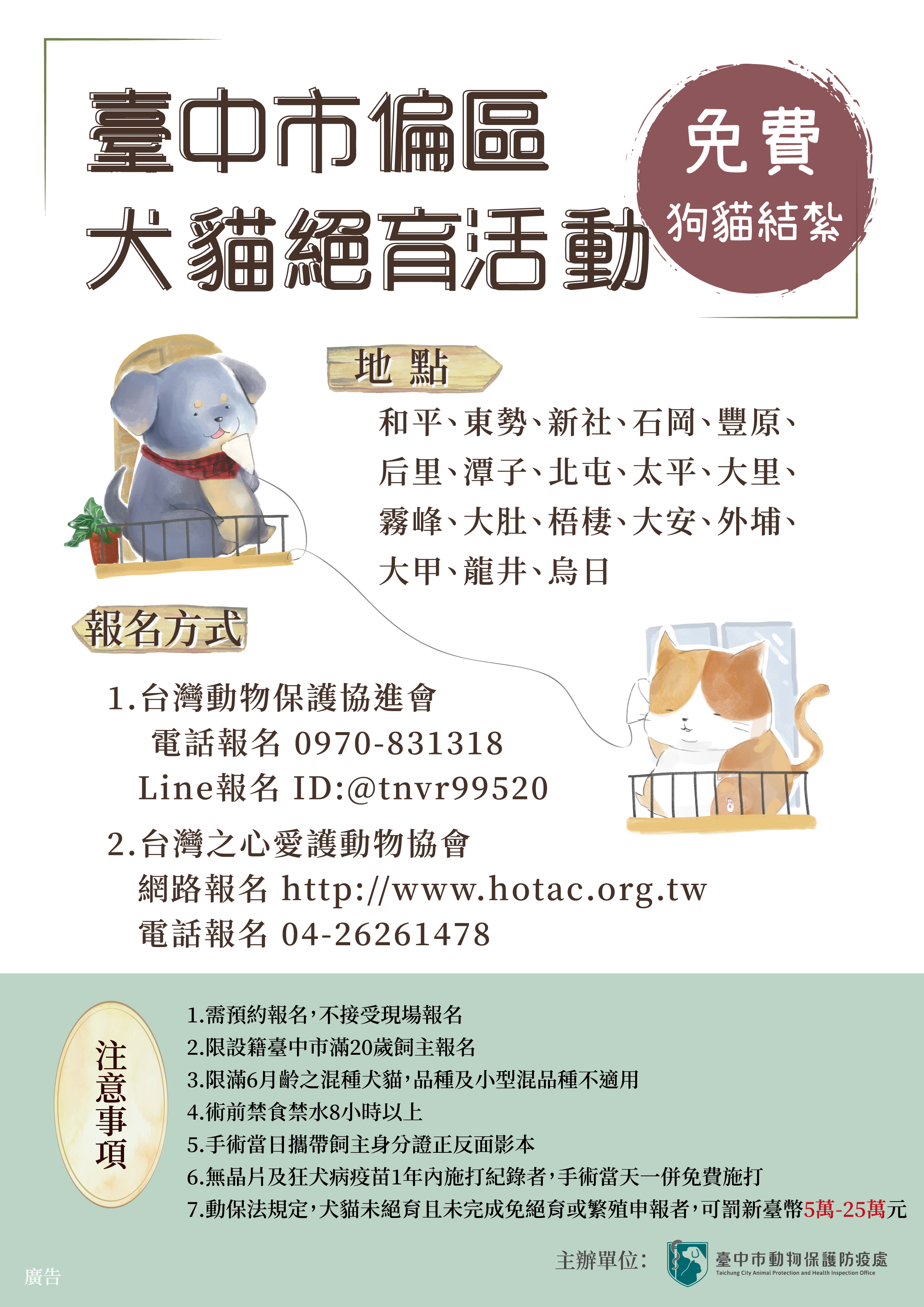 台中市動物保護防疫處為為維護犬貓健康及落實源頭管理工作,今年持續辦理偏區犬貓絕育活動,免費提供犬貓絕育、寵物登記及施打狂犬病疫苗服務,凡飼養地點及設籍在台中市,且年滿20歲的市民均可為寵物報名。
