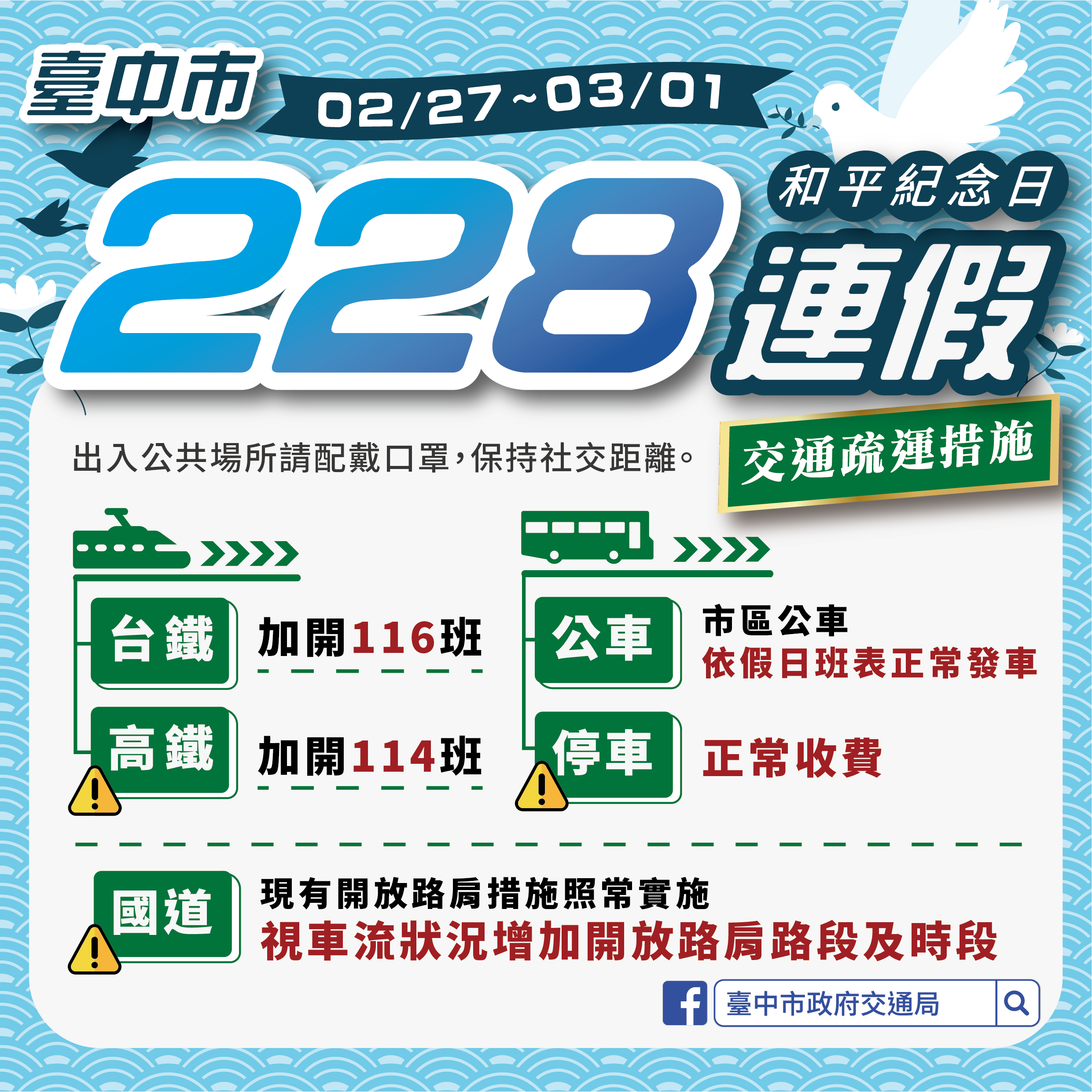 二二八連假將至且適逢櫻花季,台中市政府協調交通部高速公路局,視國道及地方車流狀況適時放寬匝道儀控管制、延長國道路肩開放時段;公共運輸方面高鐵與台鐵將分別加開114班及116班列車。此外,連假期間民眾也可搭乘大眾運輸至台中武陵及后里賞櫻花、谷關泡溫泉、高美濕地看夕陽、百貨及OUTLET購物與享用在地美食,輕鬆度過愉快假期。