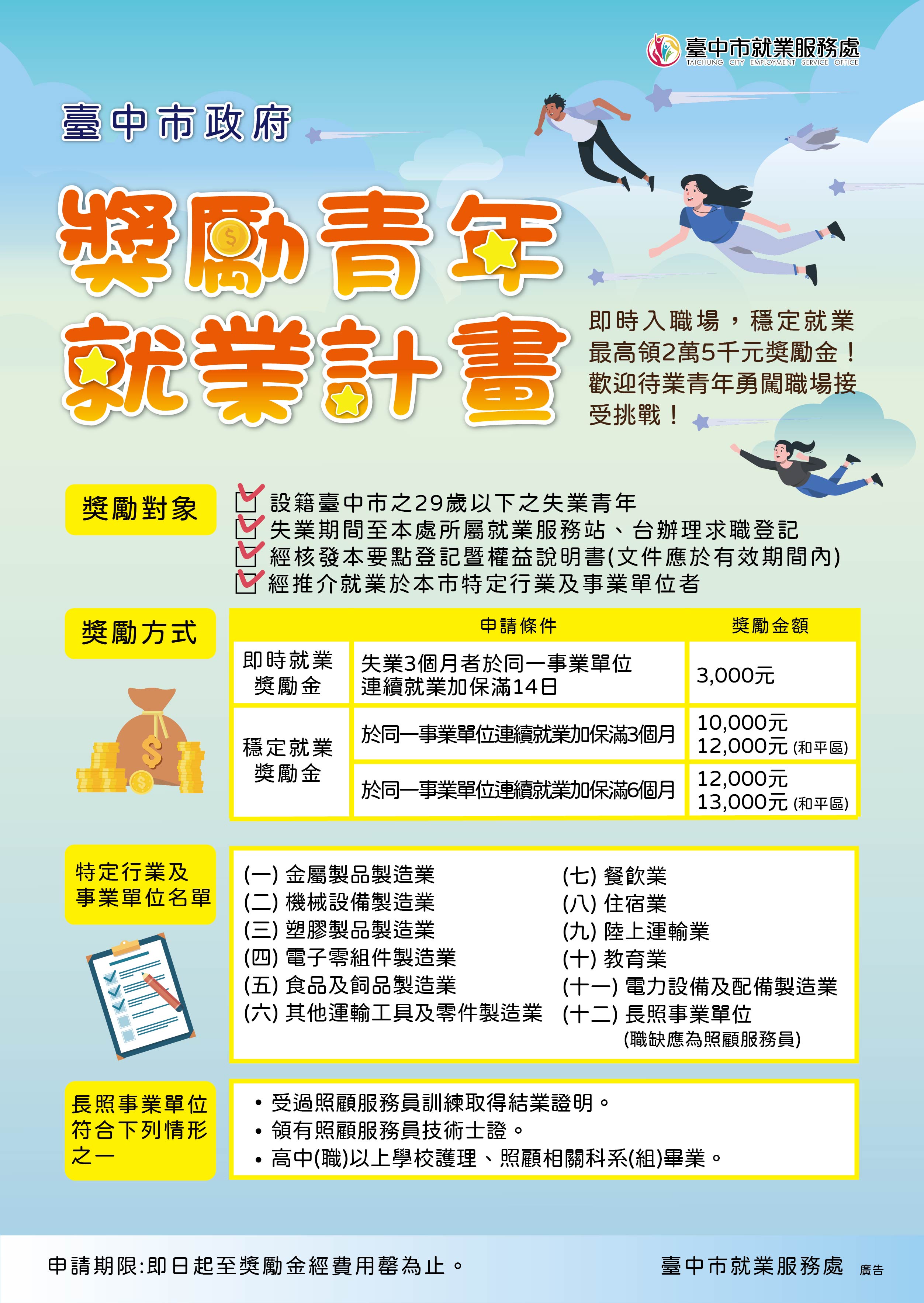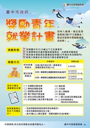 台中市政府為鼓勵待業青年積極尋職與立即就業,去年推出「即時就業獎勵金」,針對設立籍台中市待業超過3個月以上的青年,經介紹就業滿14天,即可領取「即時就業獎勵金” 3,000元,若青年再持續就業滿6個月,獎勵金最大可達2萬5,000元。自去年開辦至今,已協助逾170位失業3個月的怯志青年,重新就業市場。
