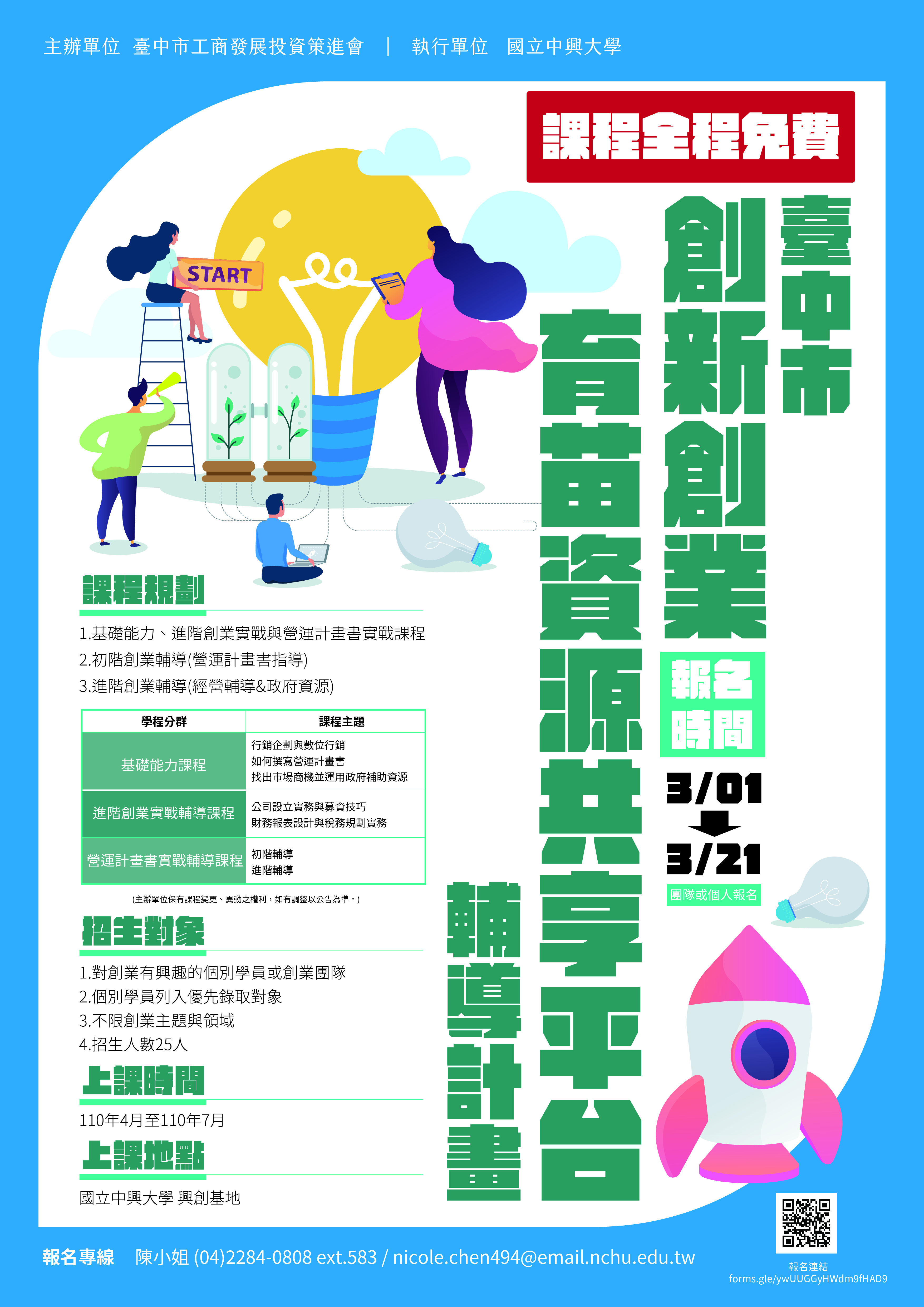 工策會表示,創業系列課程於3月開始報名,開設地點在國立中興大學興創基地,課程安排在4月至7月的週六全天,內容涵括基礎創新創業能力課程、進階創業實戰課程與營運計畫書實戰輔導,課程結束後由學員完成營運計畫書,並提供業師輔導資源,協助營運輔導與協助政府資源申請。相關訊息可於計劃活動網頁( https://www.ersptaichung.com/ )查詢,或電洽04-22840808分機583陳小姐。