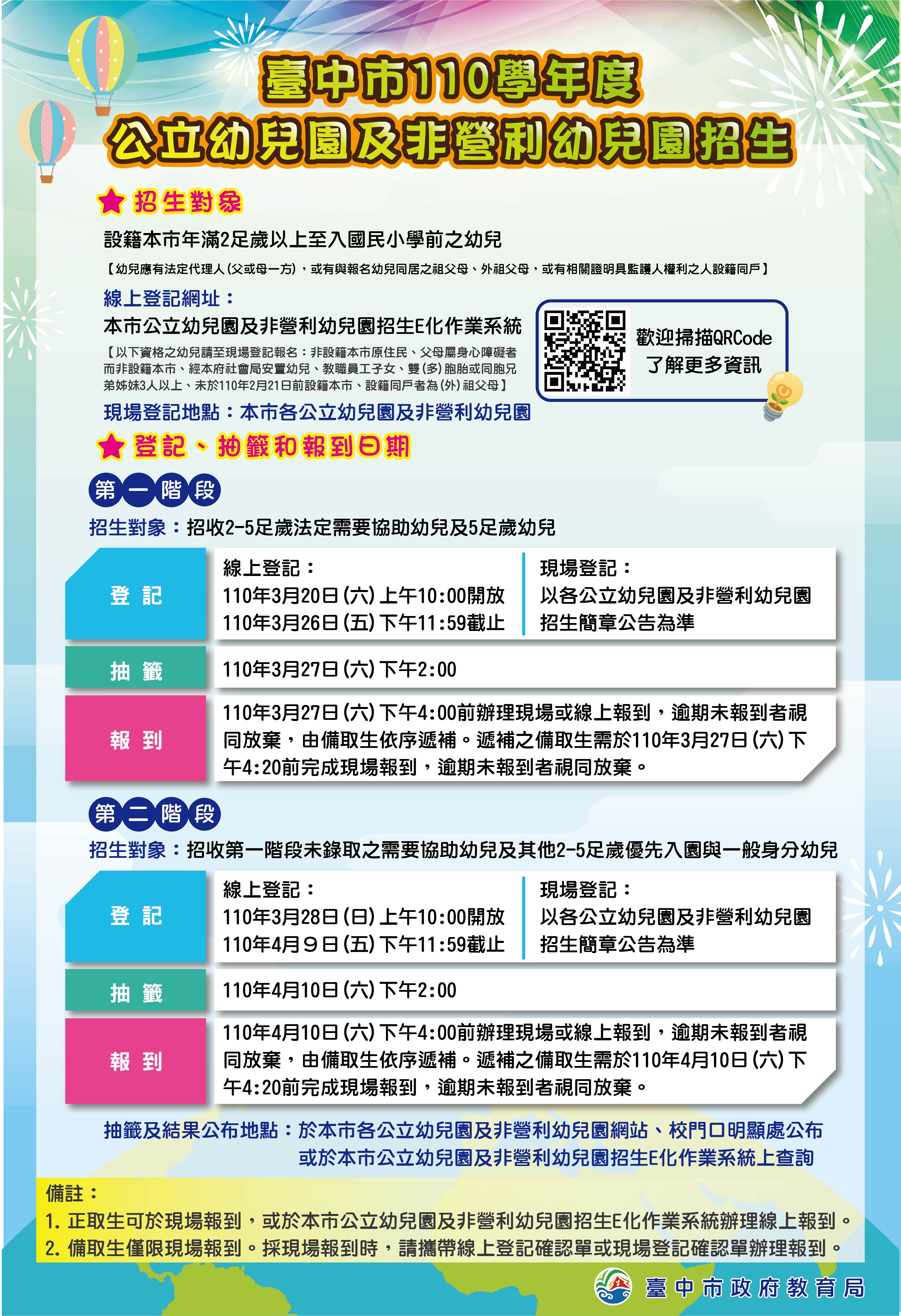 110學年度台中市公立幼兒園及非營利幼兒園,將自3月起陸續公告招生簡章,此次招生援例分二階段辦理,第1階段自3月20日至3月27日止,第2階段自3月28日至4月10日止,請家長於期限內辦理報名登記。教育局表示,今年採現場及線上登記報名雙軌並行,另採電腦化抽籤、以及線上或現場報到方式,全程免出門、免排隊,健康又安心。